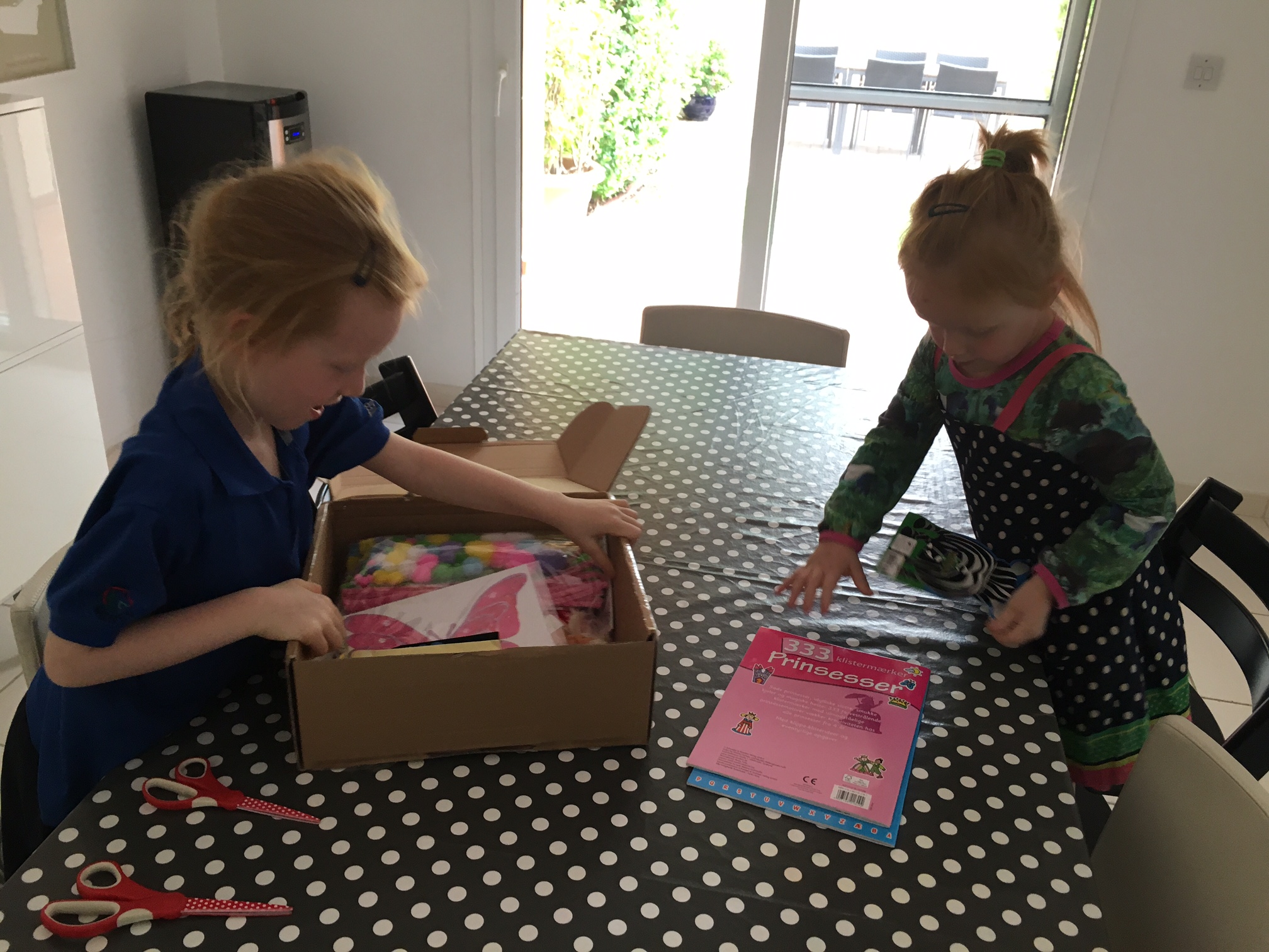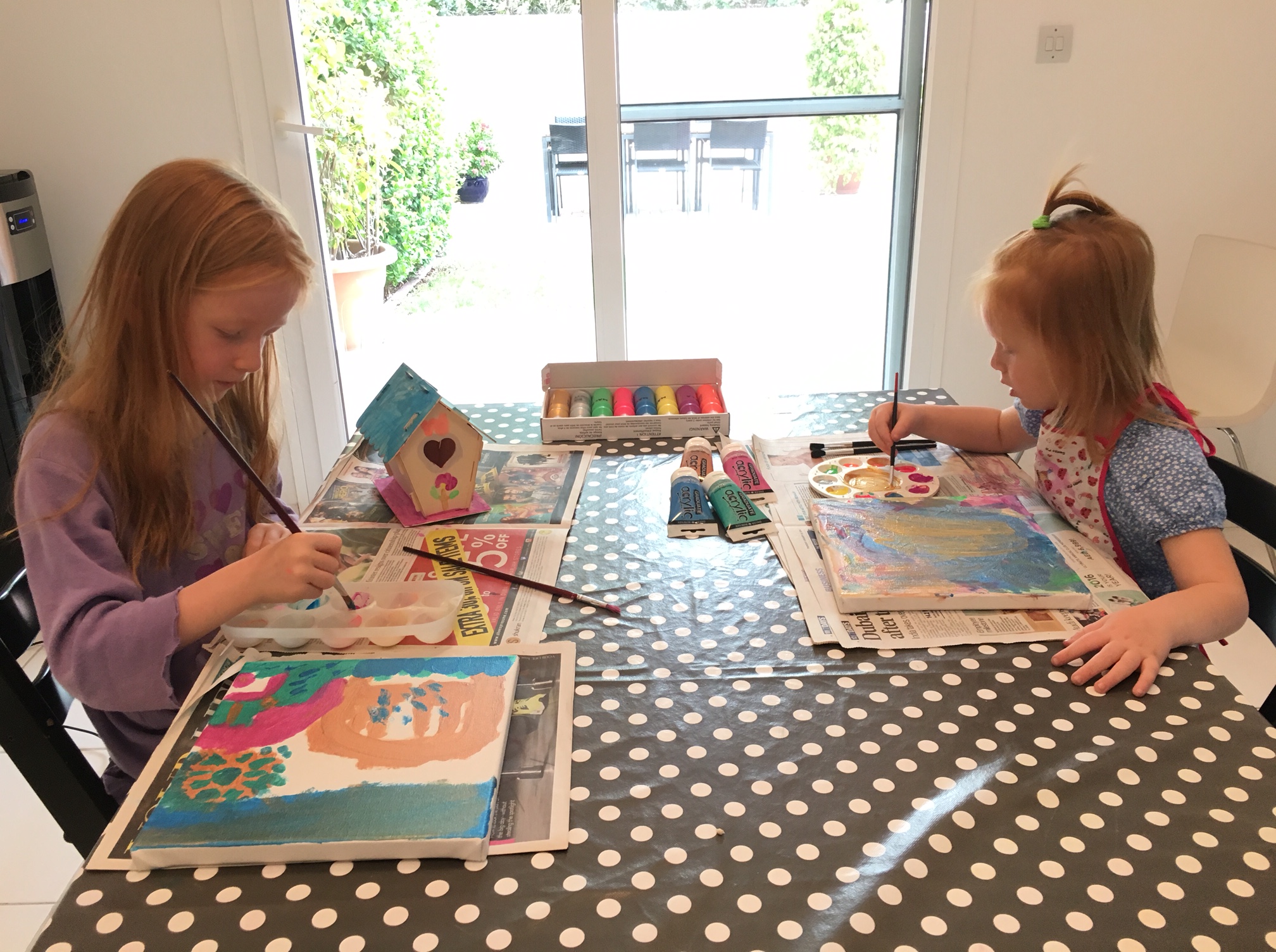Da pigerne er færdige med kartoffelmos, laks og dessertbuffet ad libitum, sætter de sig til at tegne, mens de gamle forældre fortsætter med at vælte sig rundt i asiatiske delikatesser og søde sager i én pærevælling.