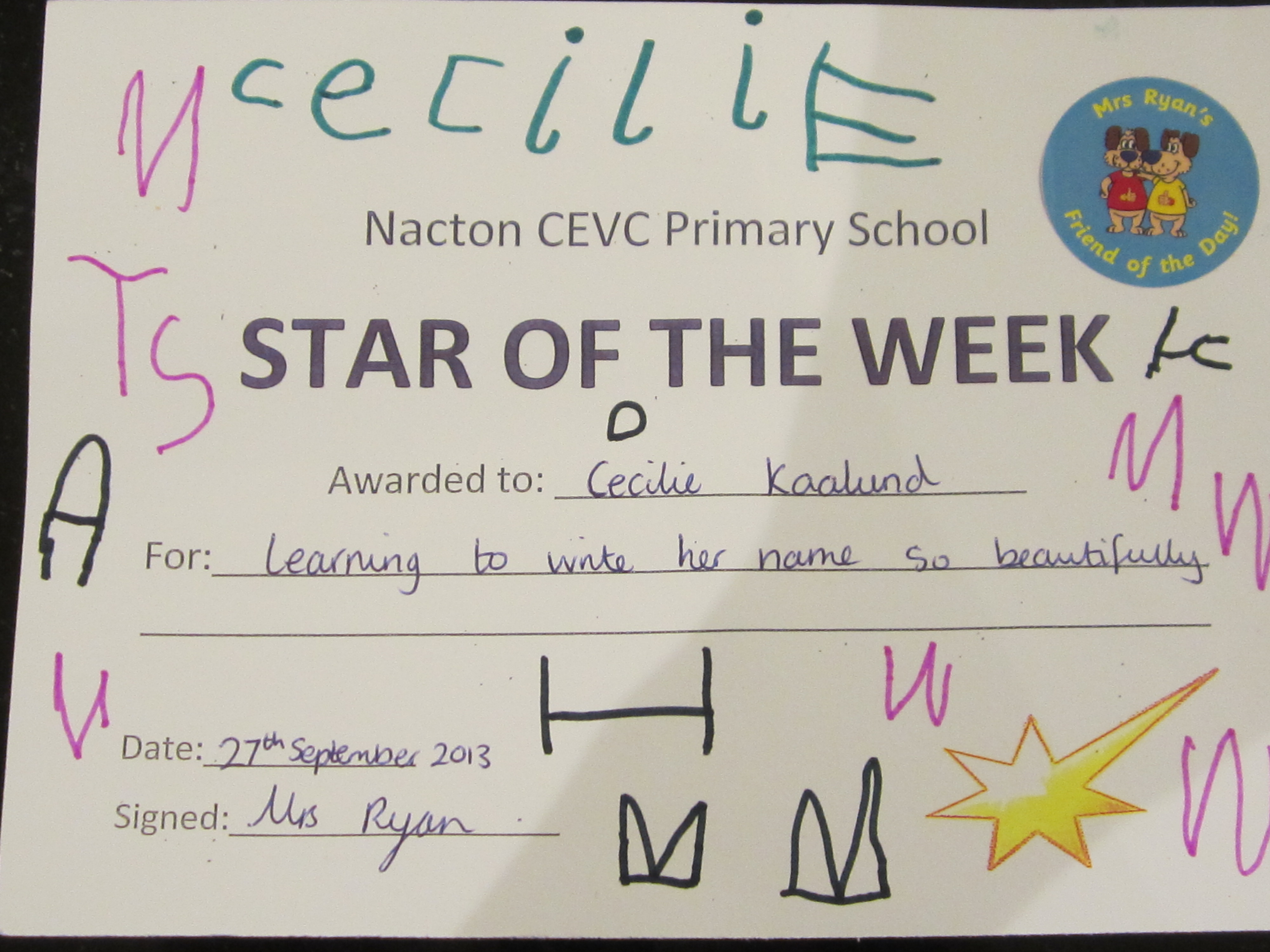 I sidste uge havde hun den store glæde at blive valgt til “Star of the Week” på skolen, fordi hun har lært at skrive sit navn. Her er hendes diplom (med lidt ekstra dekoration tilføjet herhjemme). Det blev overrakt ved fredagssamling i skolens hall: