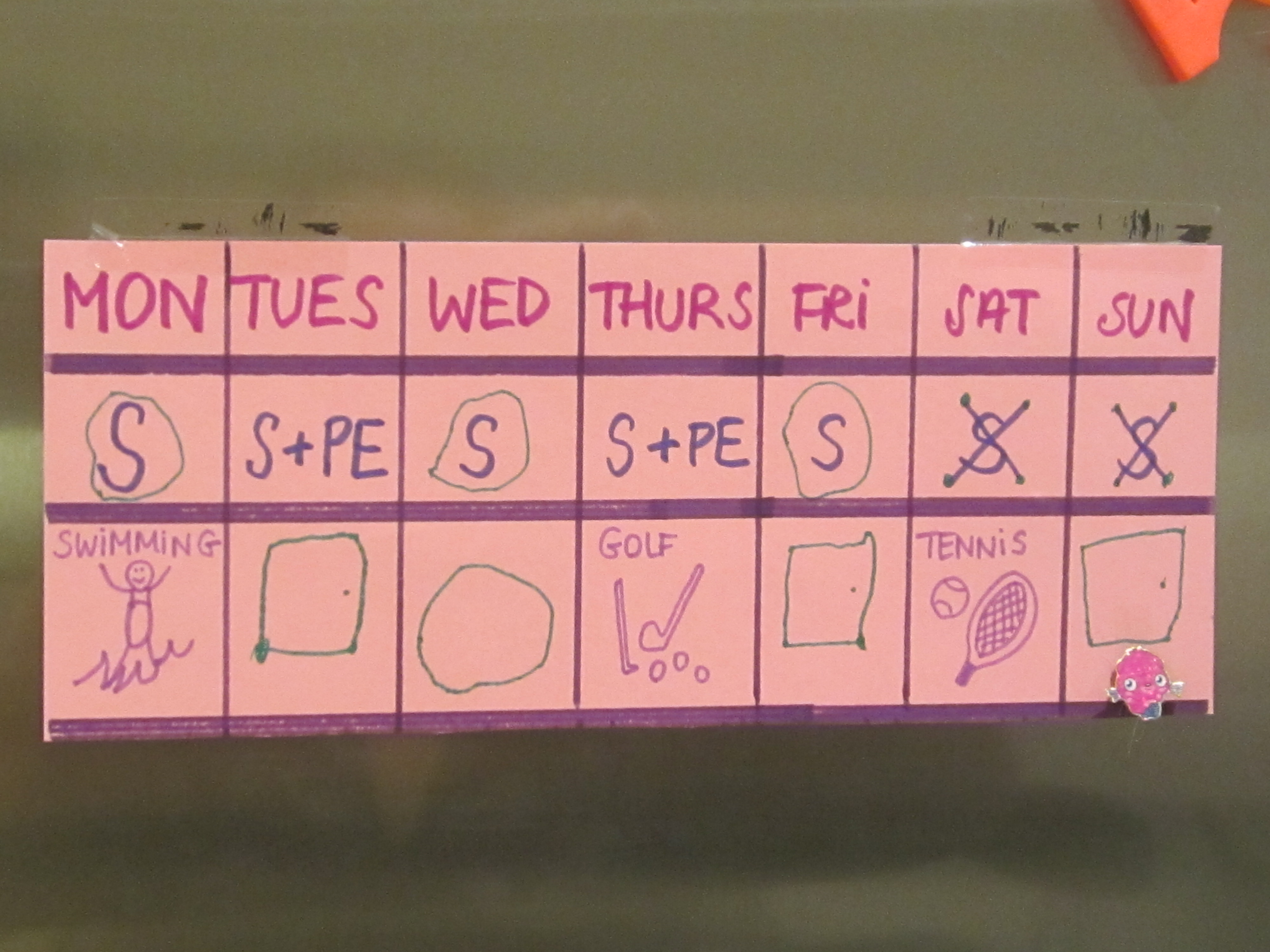 S står for School. PE står for Physical Education (idræt). Så er der svømmeundervisning om mandagen, golftræning om torsdagen og tennistræning om lørdagen. Cille’s  “firkanter” på tirsdag, onsdag, fredag og søndag er ifølge hendes egen forklaring en slags døre, som åbner op til at man kan være hjemme og gøre lige hvad man vil. Hun elsker at forudsige dagens forløb og arbejder meget med tidskoncepter – i går, i morgen og i overmorgen – og dertil er skemaet et stort hit.