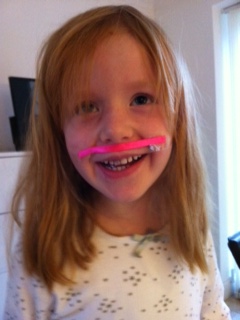Både lørdag og søndag har pigerne leget dejligt sammen. Mille har tegnet med tusch alle andre steder end på papiret. Cille har skrevet bogstaver og lavet silkebånd-tape-kombinationer. Det blev endda til et lille klædeligt overskæg i pink silkebånd. Og en togbane eller to får madammerne også altid bygget.