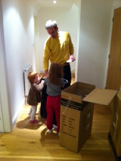 Pigerne hjælper nysgerrigt til med udpakningen af de store papkasser.
