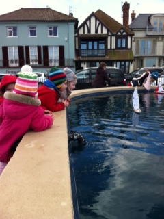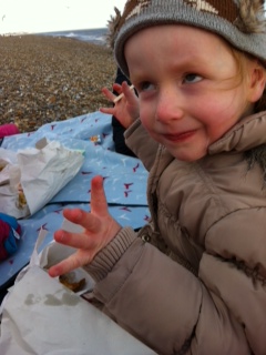 Vi går ned på stranden og åbner poserne med de dampende varme fisk, som vi spiser med bittesmå trægafler, mens vi ser ud over havet, lytter til bølgerne, stirrer hvast på havmågerne og smiler tilbage til 4 glade unger, der får ansigterne pyntet med lige dele solvitaminer og fisk.