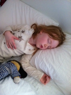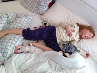 Vi skulle lige ligge lidt i sengen, mens Mille sov lur – og efter et øjeblik sov vi begge. Så alle 3 trunter er sløje, trætte, matte og udkørte. Martin er ikke ret meget bedre…nu må det gerne snart holde op! Knus til dig!