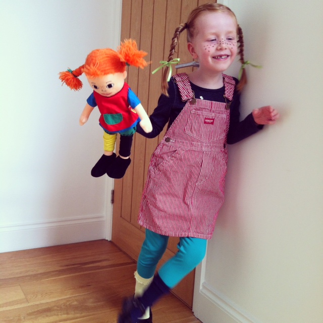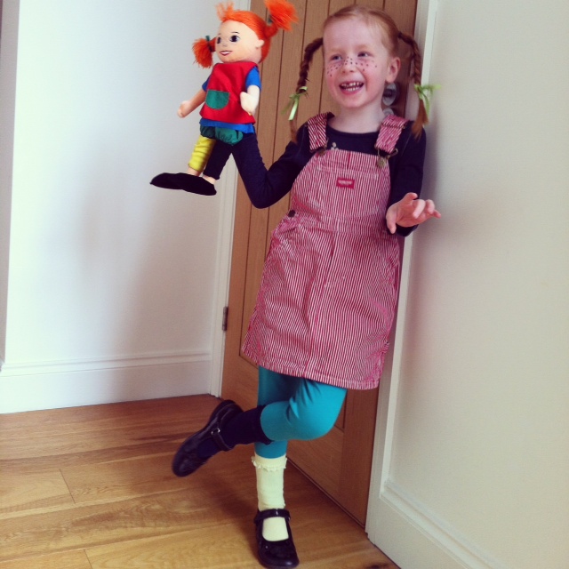 Cille hoppede heldigvis med på min (manipulerende) idé om at blive udklædt som Pippi Langstrømpe, selvom det faktisk ikke er yndlingsbogen for tiden. Hun kan ret godt lide tanken om at være verdens stærkeste pige og kalder sig selv for ‘virkelighedens Pippi’.