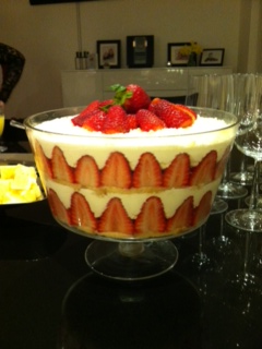 Og lad mig da lige indskyde et billede af den mest fantastiske jordbær-amaretto-trifli, som en af pigerne havde begået og medbragt som en kærlig gestus. Den var kæmpestor og havde center-piece-imponator-effekt for alle pengene! Helt tydeligvist kreeret af et menneske med håndelag i køkkenet og med hengivenhed over for søde sager.