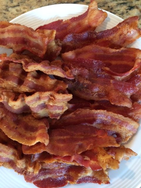 Vi kom ud med pølser og bacon. Klar til fødselsdagsmorgenmad! (Hr. Kaalund mener, at mængden af bacon, jeg serverer, er direkte proportionel med min kærlighed til ham.)