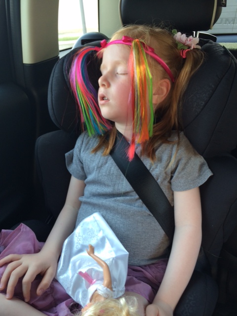Efter et par timers leg i 33 graders varme, ser Snorkefrøkenerne hurtigt sådan her ud på bagsædet: