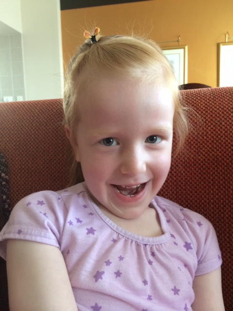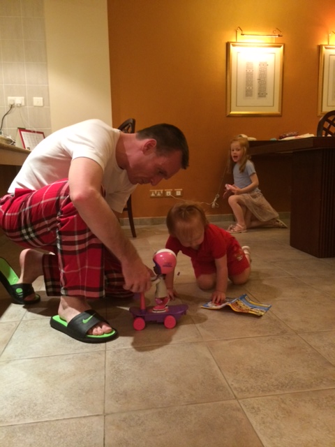 Pigerne leger konstant i pool’en eller i badekarret. Et eller andet skal tiden jo gå med, mens vi bor i en hotellejlighed.