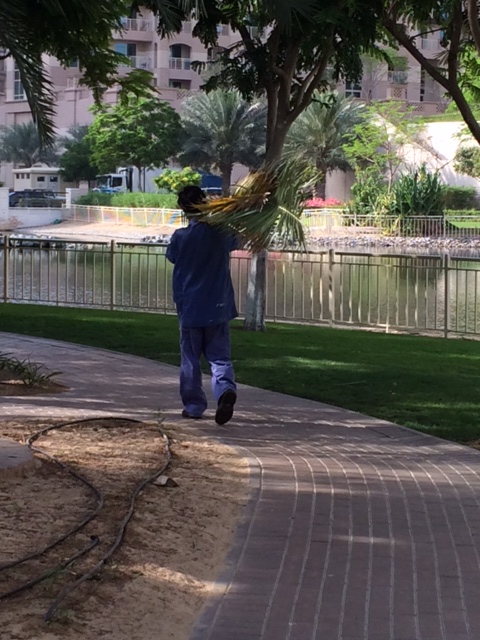 Havemand, der bærer beskårne palmeblade væk