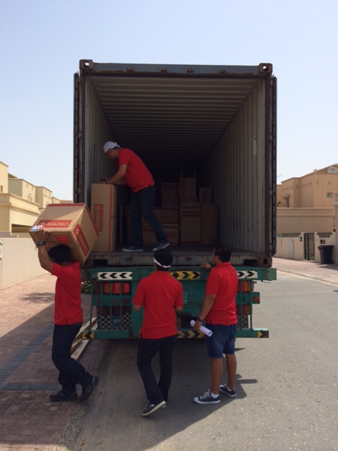 6 flyttemænd og 1 sjakbajs. Flinke, venlige og hjælpsomme. De tømmer 40 fods containeren på et øjeblik og er straks i gang med kasser og montering indendøre.