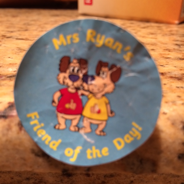 I aften finder jeg et lille klistermærke på bunden af en pose i Cille’s skrivebord. Det er fra hendes sidste skoledag i England, hvor Mrs. Ryan udnævnte hende til “Friend of the Day”.