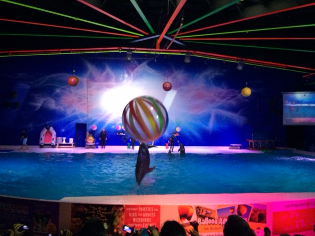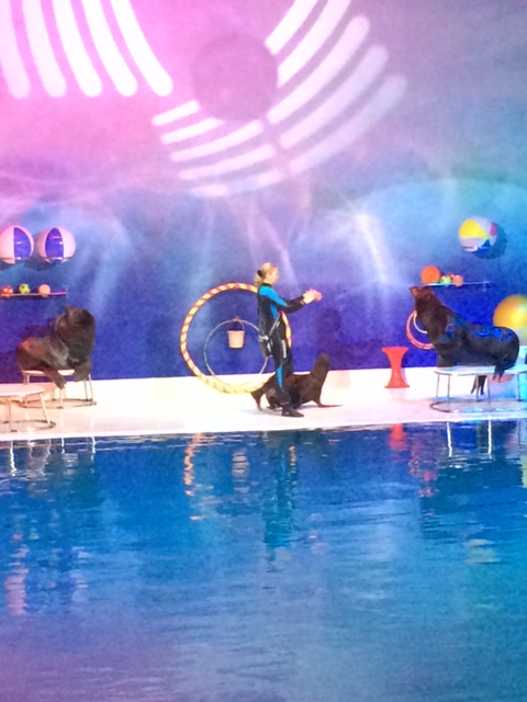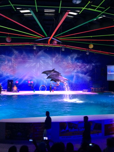 Efter en halv times kiggen i parken, lister vi i Dubai Dolphinarium sammen med horder af indere og arabere. Vi er i et åbenlyst undertal her og jeg skynder mig at hive en cardigan på. Jeg føler mig hurtigt “afklædt”, når de andre er i fuld araber-mondering.