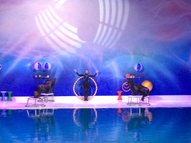 Men uanset lokal-kolorit, er show’et en stor succes hos begge pigerne. Cille hviner, griner og klapper begejstret over delfinerne. Mille stirrer betaget på delfiner og lysshows-hurlumhej, mens hun sidder trygt i Daddy’s favn.