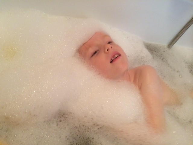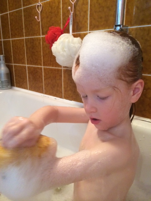 Jeg falder i staver og fylder badekarret med skumbad til verdens længste karbad for 2 små havfruer.