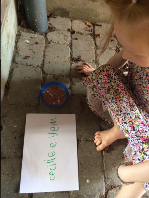 Og så laver hun en skål havregryn med CocoPops og mælk som lokkemad. Dertil lægges en ukrudtsblomst og en lille udklippet kat.