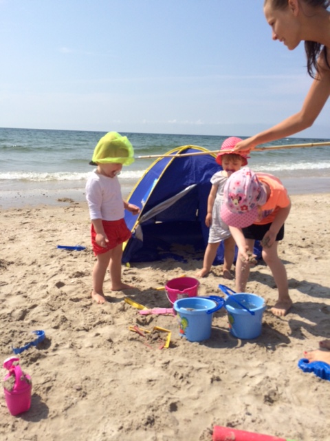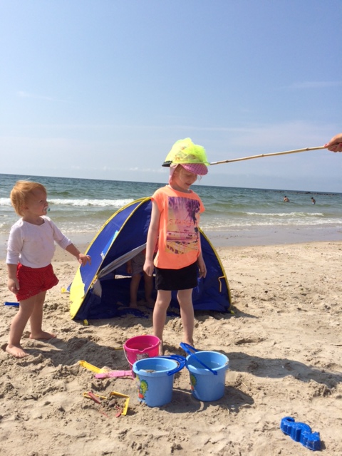 Vi leger på stranden i timevis. Bygger kanaler og sandslotte.