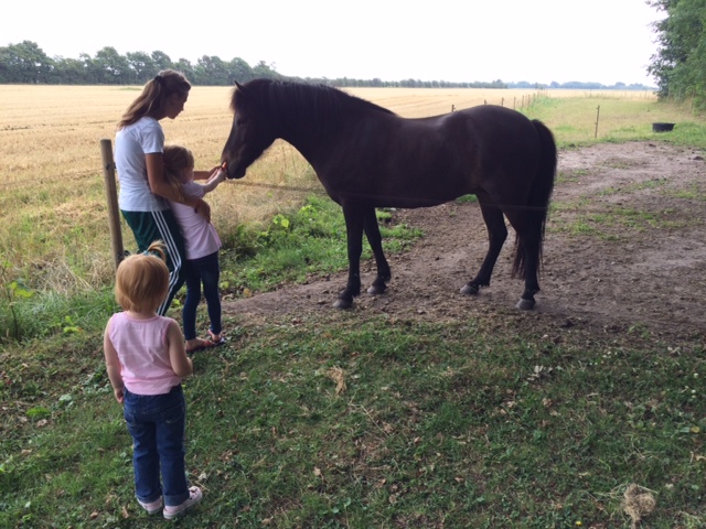 Et øjeblik senere skal Fró, Sunrise og Viggo fodres med gulerødder. Pigerne er noget reserverede overfor de store heste.
