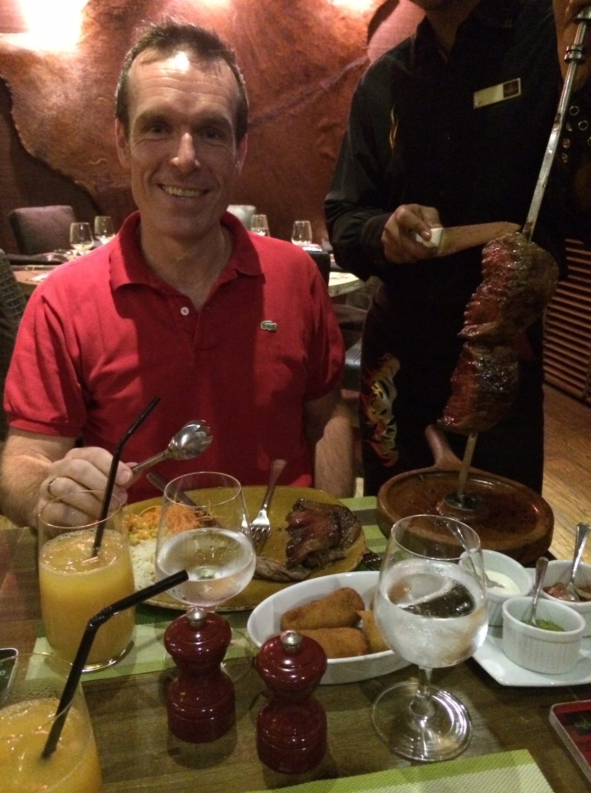 Mens vi sniger os ud til en brasiliansk kødfest af en anden verden. Churrasqueira, hedder det vist, når brasilianerne fixer døde dyr udskåret på 15 måder og grillet på lange spyd. Det smager vanvittigt godt. Og man bliver uudholdeligt mæt.
