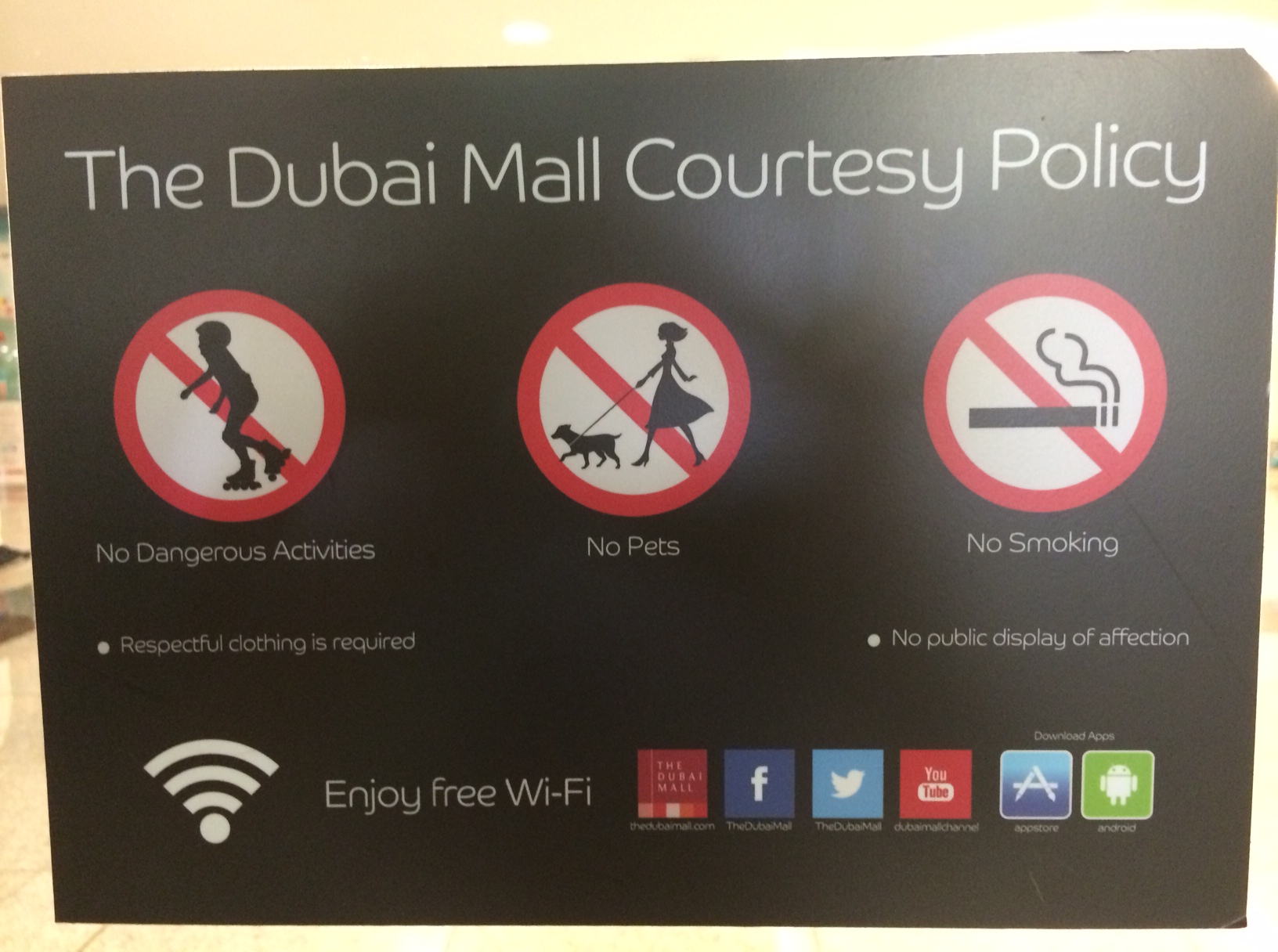 Ved ind- og udgangsdøren i Dubai Mall falder mine øjne lige over stedets ordens-reglement: