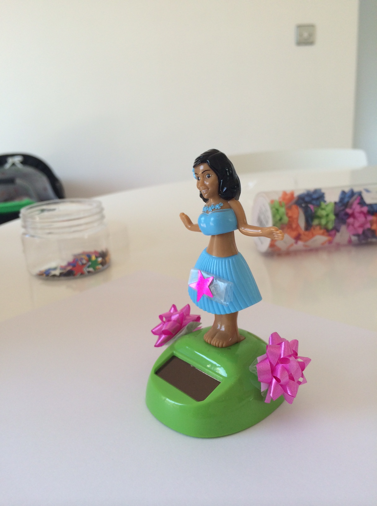 Den solcelle-drevne hula-pige bliver testet i den ubarmhjertige eftermiddagssol. Hun speed-vrikker med hofterne, så vi griner højt.