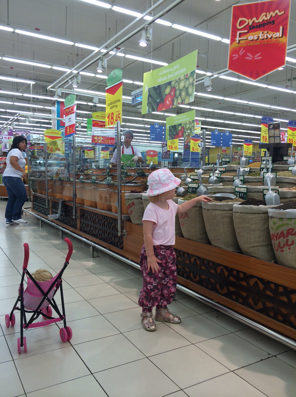 Mille medbringer naturligvis en baby i klapvogn, som vi så slæber rundt på sammen med en kæmpe indkøbsvogn.