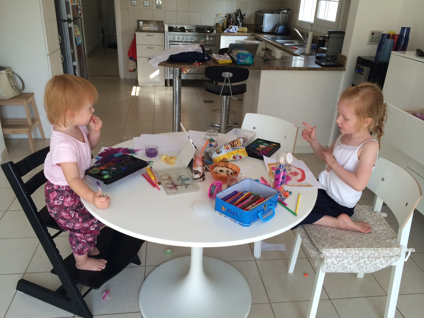 Da Mille vågner af sin lur, har Cille gjort klar til eftermiddagshygge for dem begge. Der er vandfarver, pensler og papir. Og så har hun hældt halvdelen af sine chips ud ved sin søsters plads.