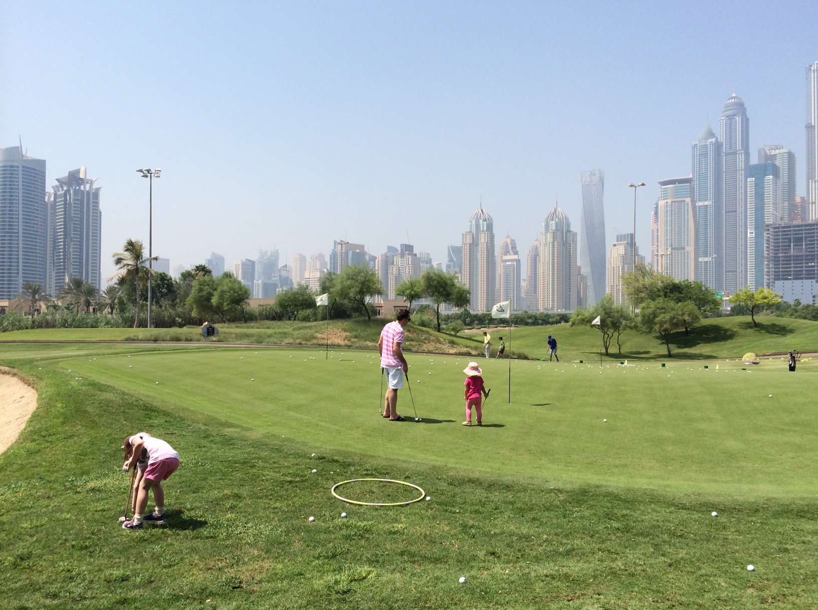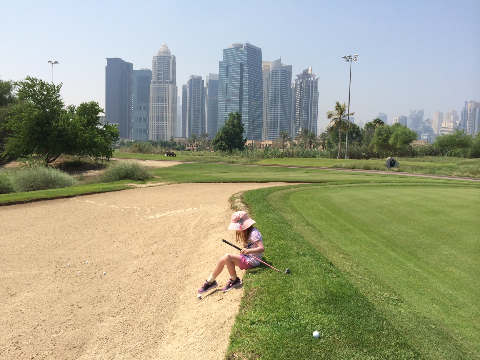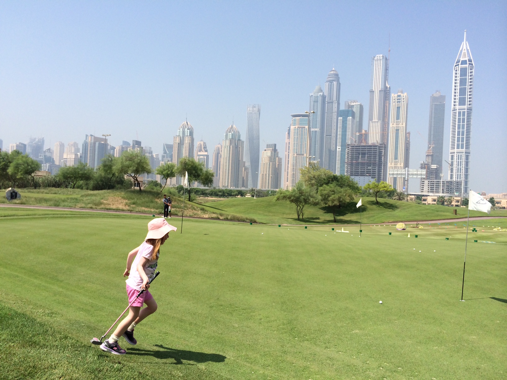 Dubai’s Skyline er en imponerende kulisse til golfbanen, der er en fredfyldt tropisk oase, midt i storbyen – kun afbrudt af fuglenes kvidren.