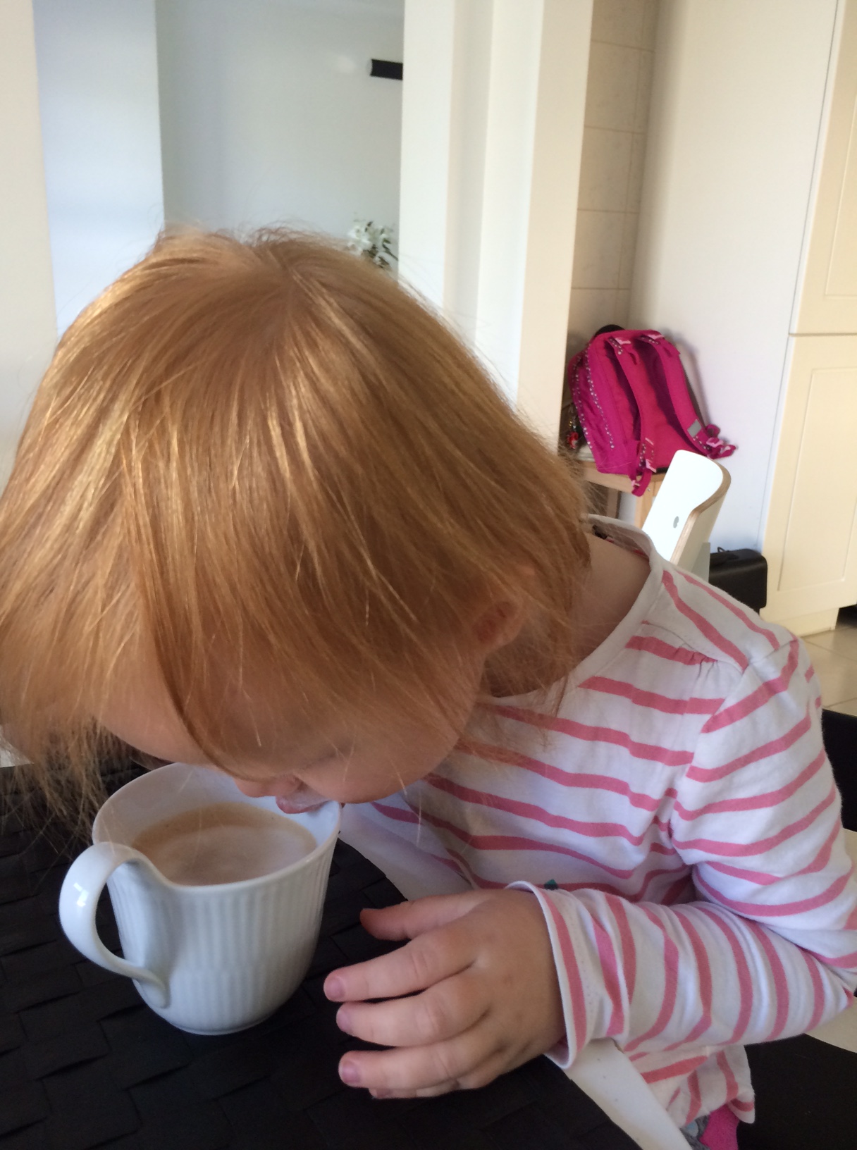 Lørdag morgen står vi op til mælkekaffe og lektielæsning. Mille ser ud til at have ret meget brug for sin kaffe.
