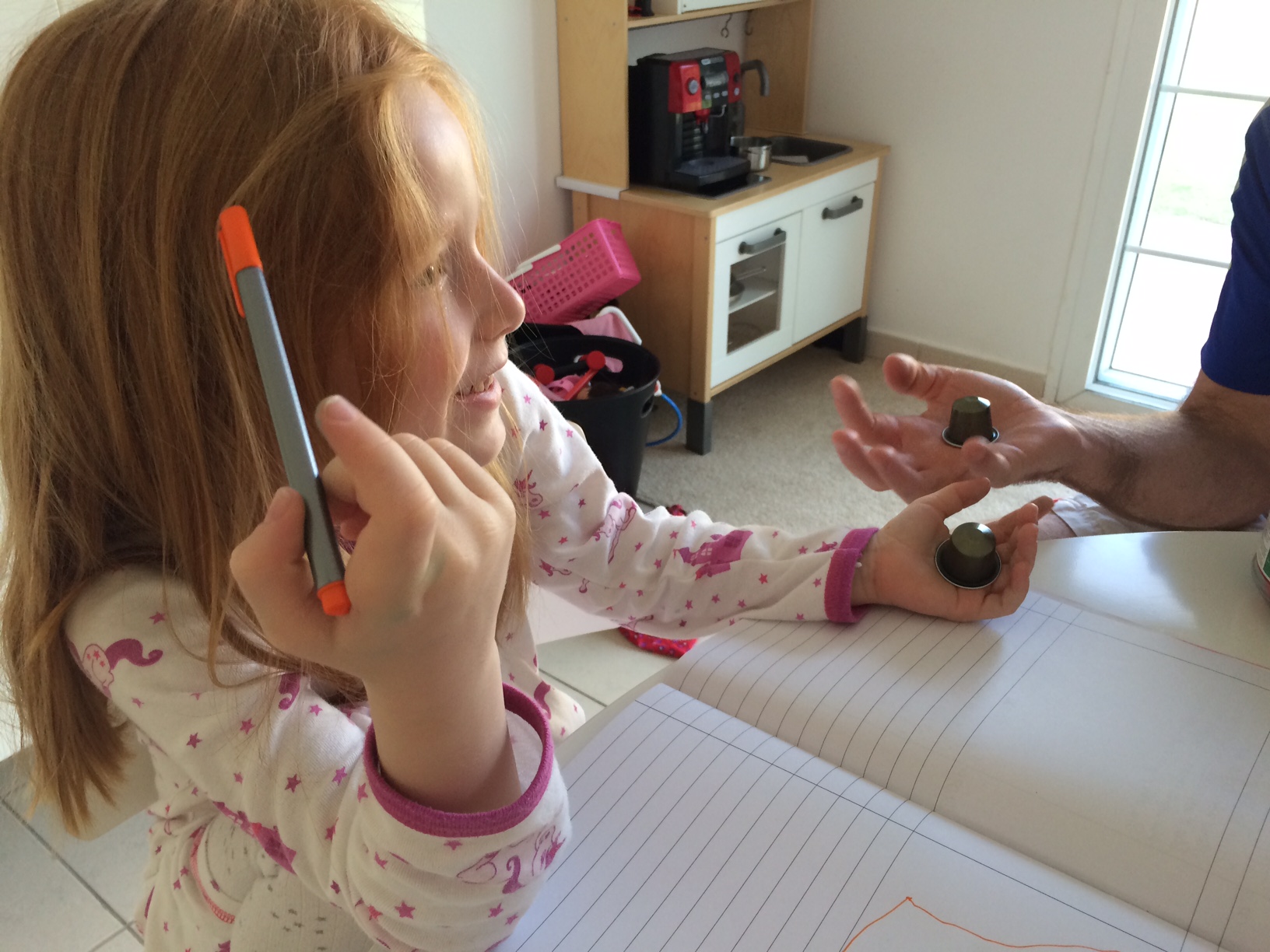 Her foretager hun mængdevurderinger i matematik sammen med Farmanden. Vi har fundet Nespresso-kapsler, pastaskruer og magnetbogstaver til formålet.