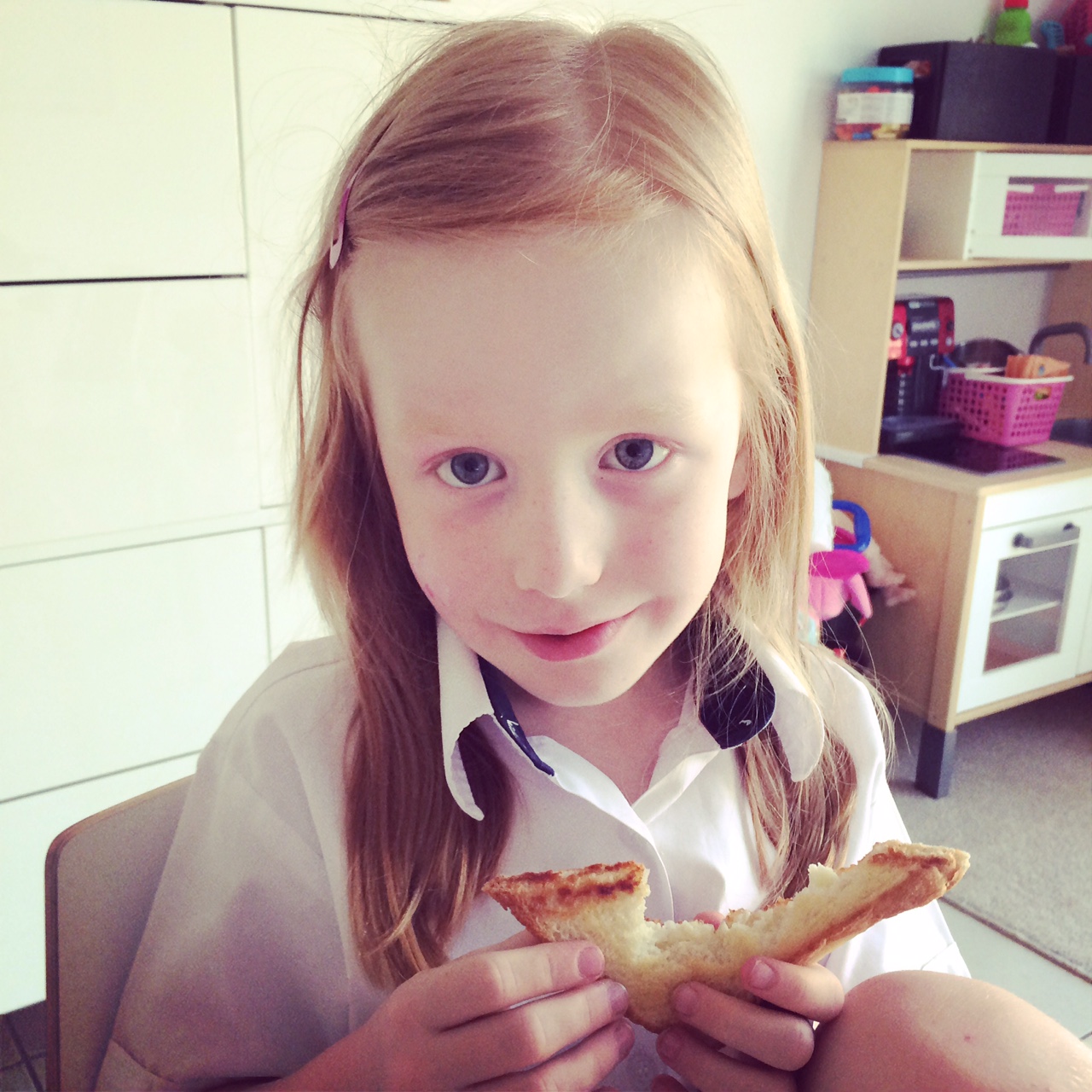 Jeg futter ind til hende og trækker beredvilligt op i blusens ærme. Det dunker i mine tindinger og jeg har sovet elendigt.