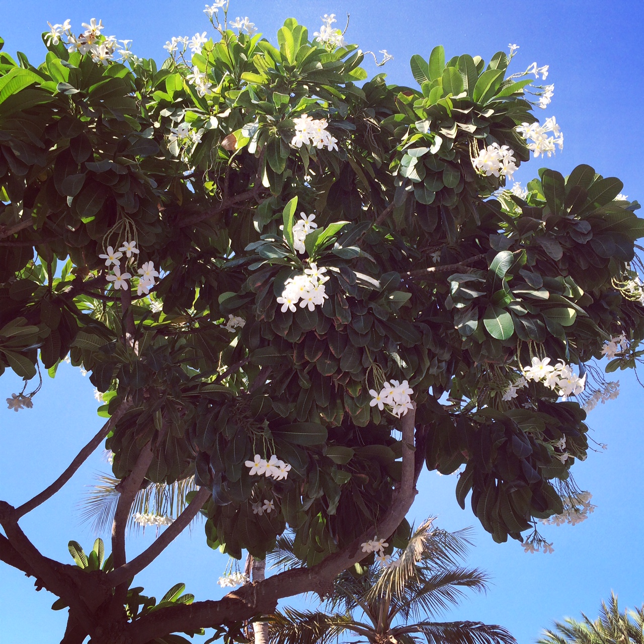 Og så ser jeg op i frangipanitræets krone, mens jeg lytter til fuglenes kvidren og det springende vand.