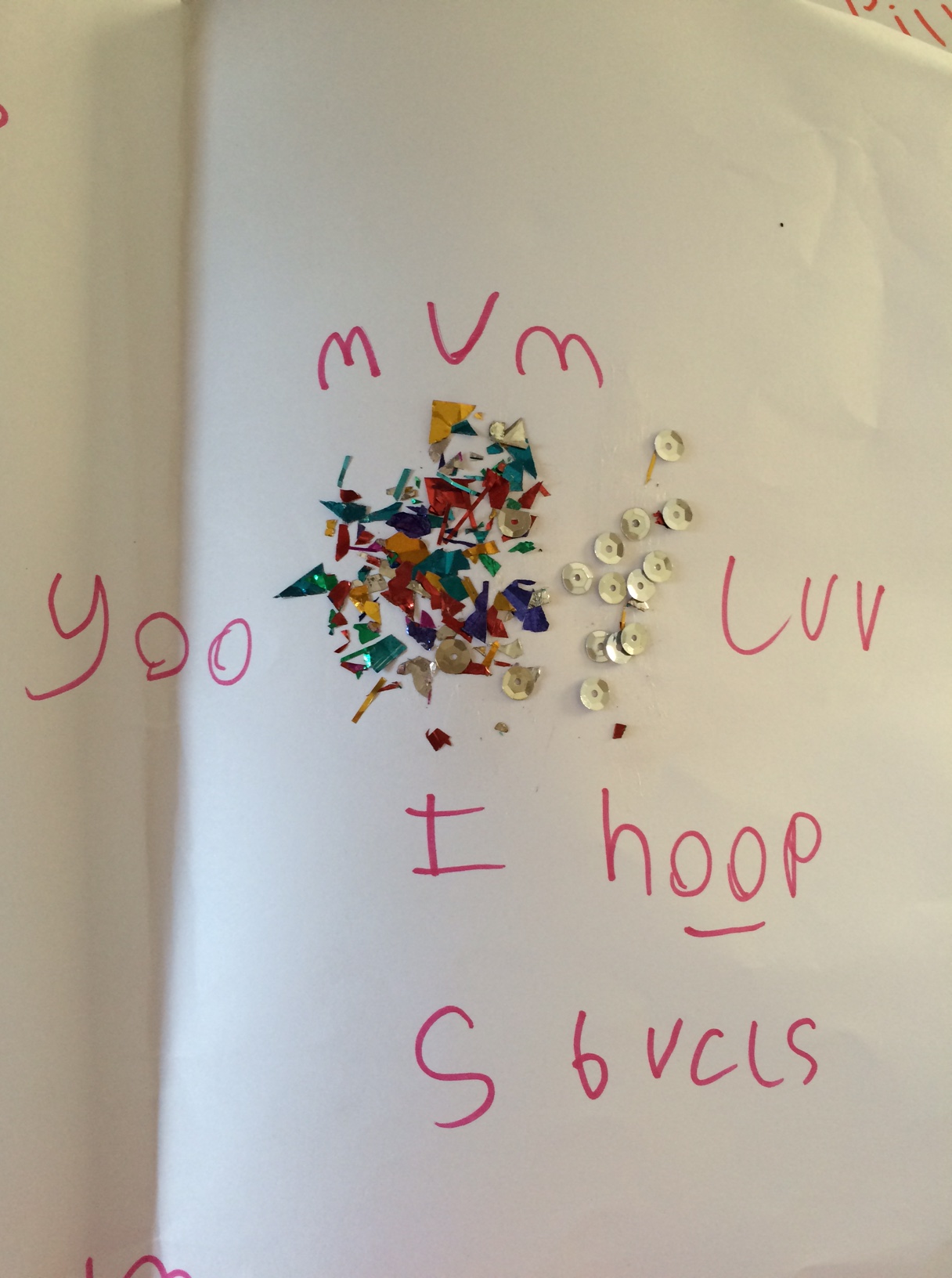 I går kom Cille hjem fra skolen med en fin tegning til mig. Ordlyden er: “Mummy, I love you, I hope you like sparkles”. Der var blevet tænkt på mig i skolen dén dag.
