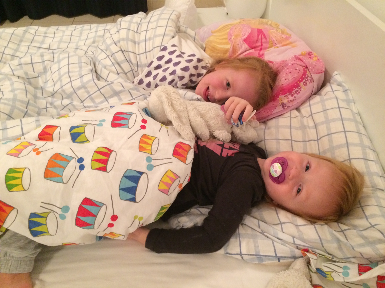 Og pigerne er blevet puttet i vores seng, fordi det er en ‘special day’, som Cille forklarer os med stor overbevisning.