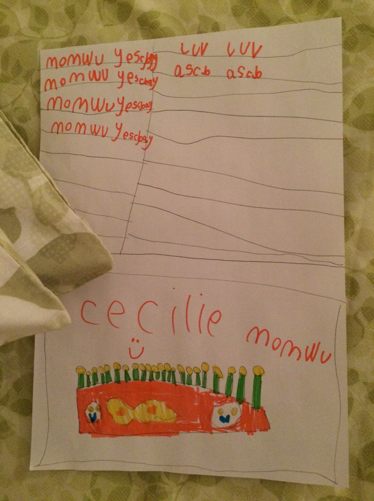 Der står: ‘Mormor, jeg elsker dig, love, love, love’ med hendes finurlige lydskrift. Og hun har tegnet en fødselsdagslagkage med så mange lys, der overhovedet kunne “fit’te på the cake”.