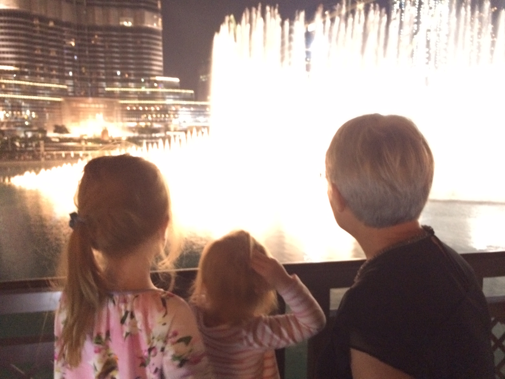 Vi er i Souk Al Bahar ved Dubai Mall, hvor man kan spise med udsigt til Dubai Fountain, der bliver ved med at imponere både os selv og vores gæster.