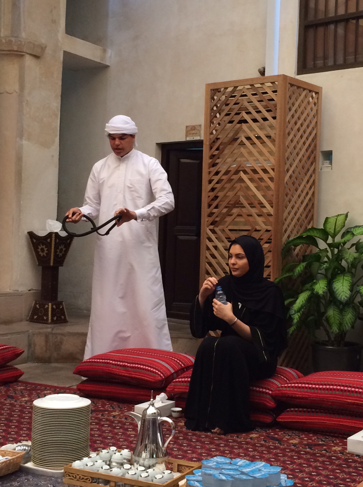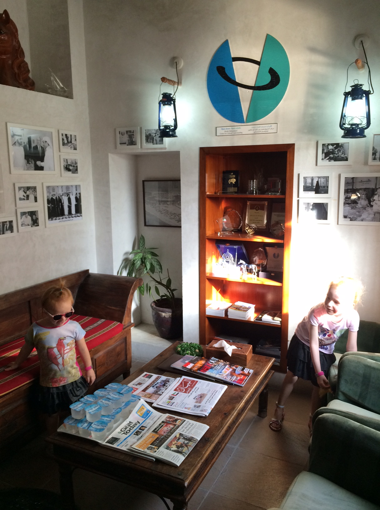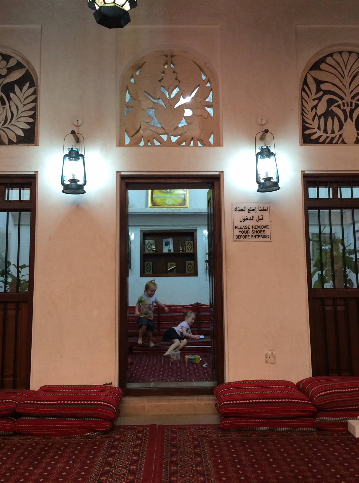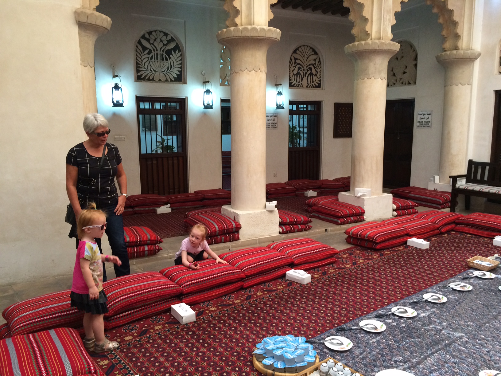Vi bliver bedt om at tage skoene af, og pigerne får legetøj med ind i et lille siderum, så de kan lege uden at forstyrre de voksnes introduktion til Emirati-kultur.