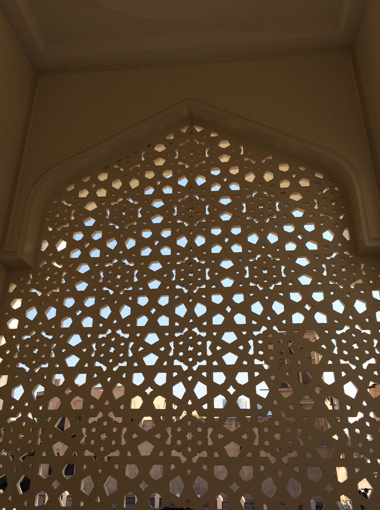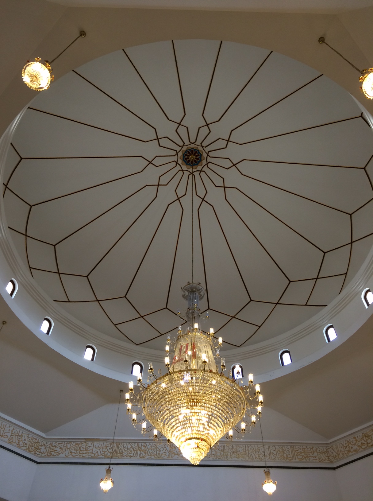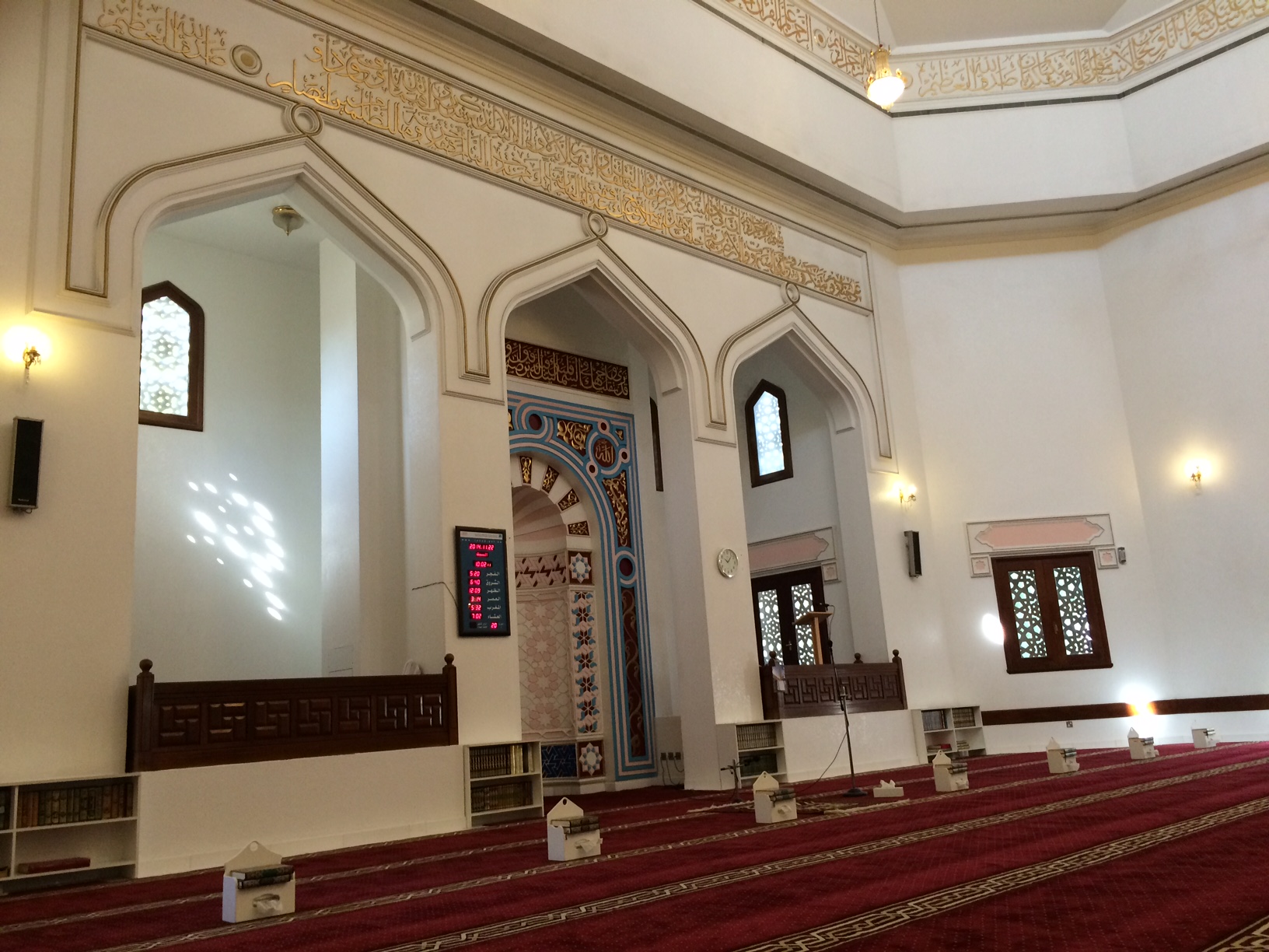 Moskéen er ualmindeligt smuk med et enkelt og moderne udtryk i ædelt træ, ægte perler og krystaller. Der er svalt, rent og velduftende.
