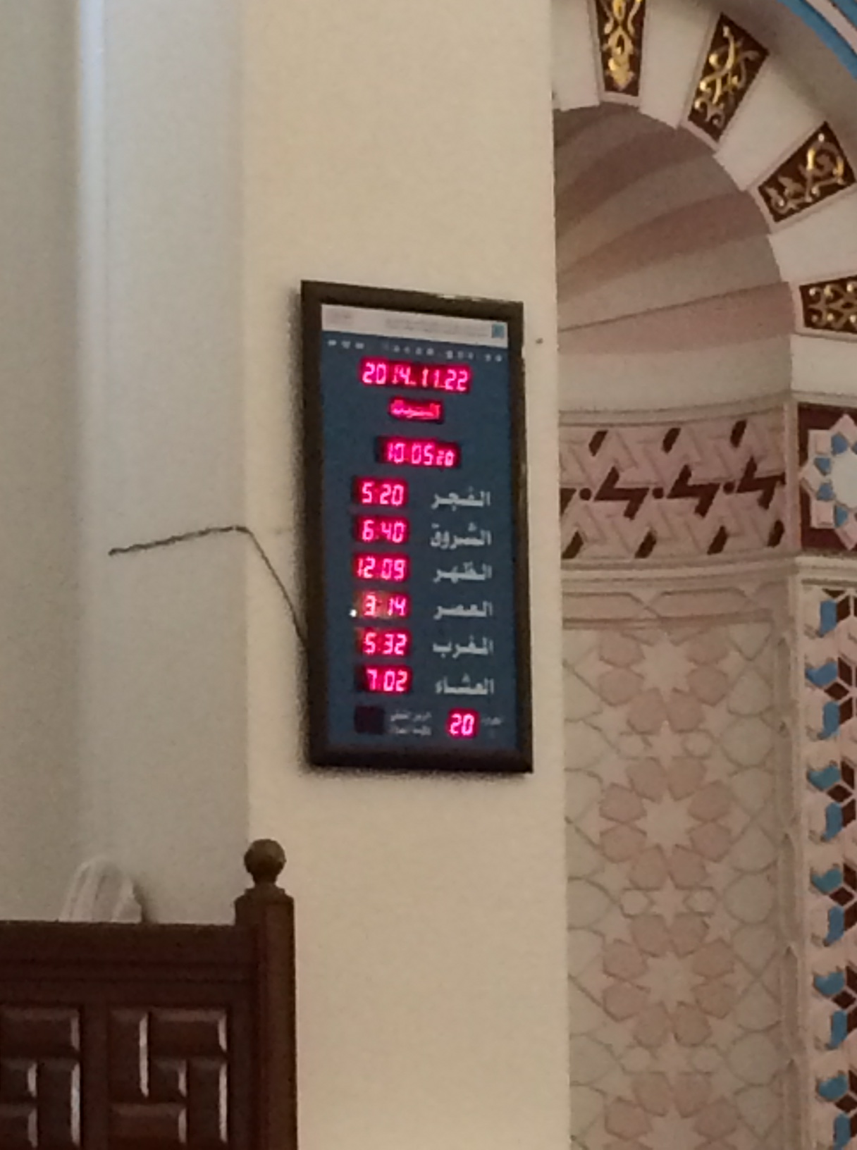 Der er 5-6 bønner om dagen, alt afhængig af hvor aktiv, man er på dén front. De to tidlige bønner kan slås sammen til én, hvis man ikke lige er et A-menneske. Bønnetiderne vises dagligt på en lille elektronisk skærm, idet de følger solen (dagslyset).