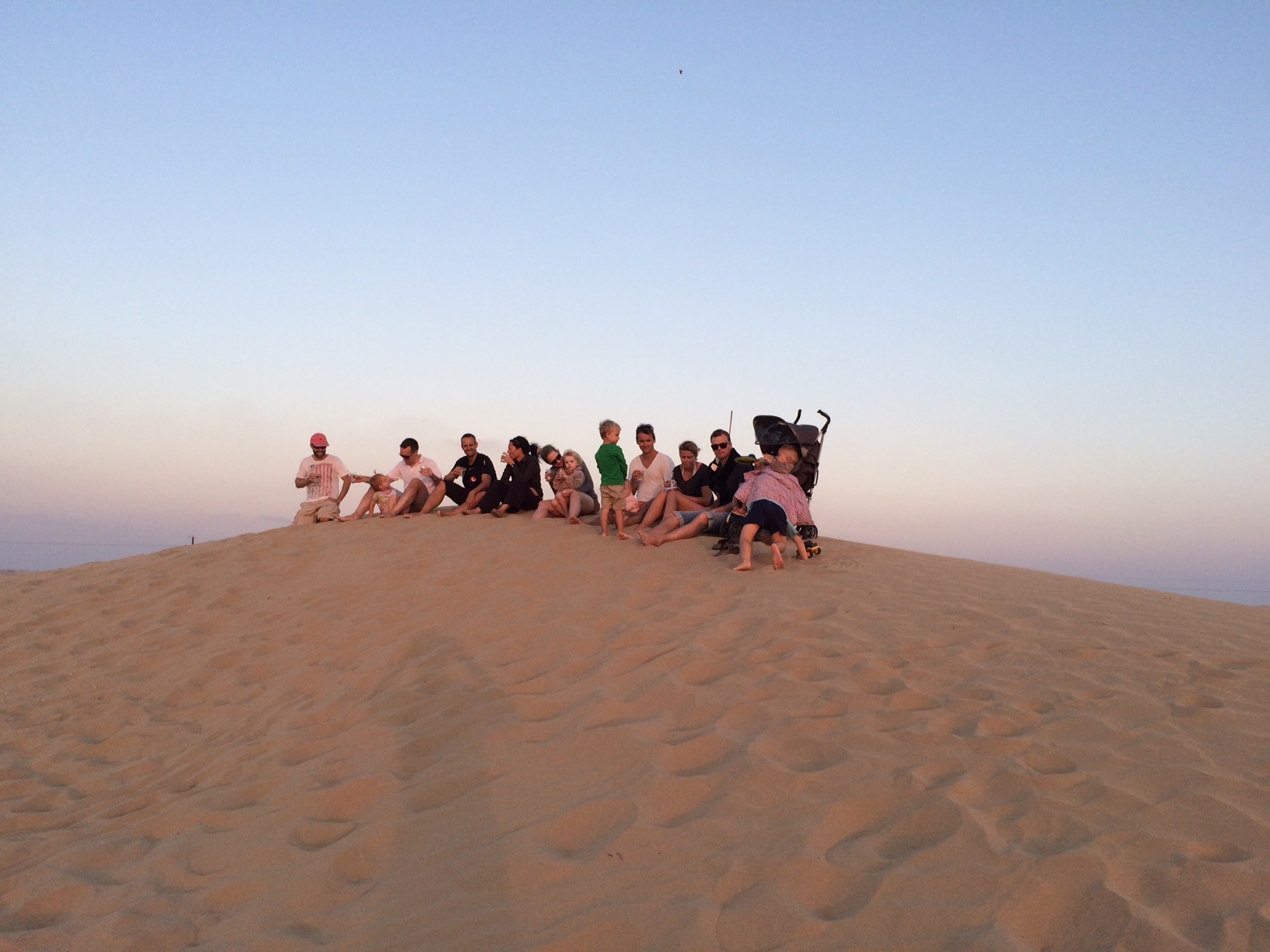 Vi samles på en sandbanke for at nyde solnedgangen.