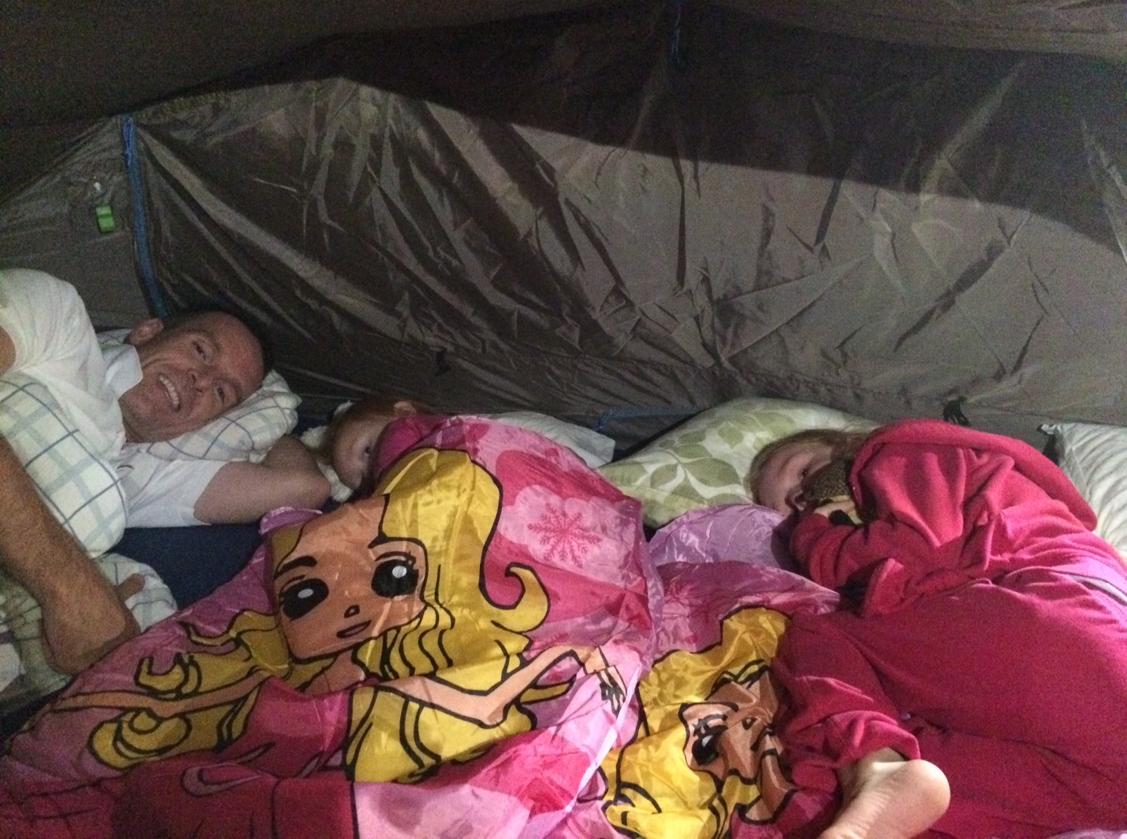 Vi rammer teltbunden kl. 22 – mætte af oplevelser og snobrød. Det varer et splitsekund, før begge pigerne er konverteret til Snorkefrøkener. De overvejer ikke engang at lege skyggeleg med lommelygterne, så trætte er de!