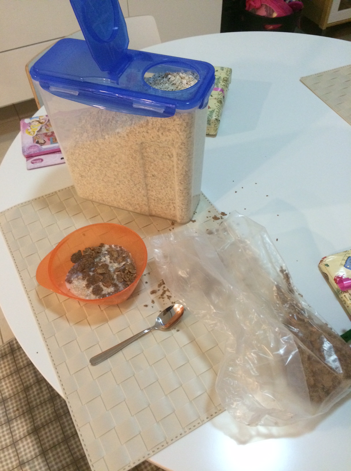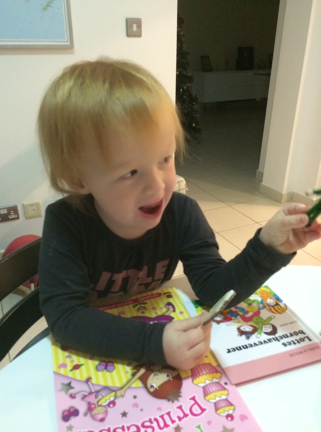 Med en Julemand, der har været forbi her til morgen med pakker til pigerne – og så har han spist morgenmad og krummet bran flakes overalt, den gamle gris.