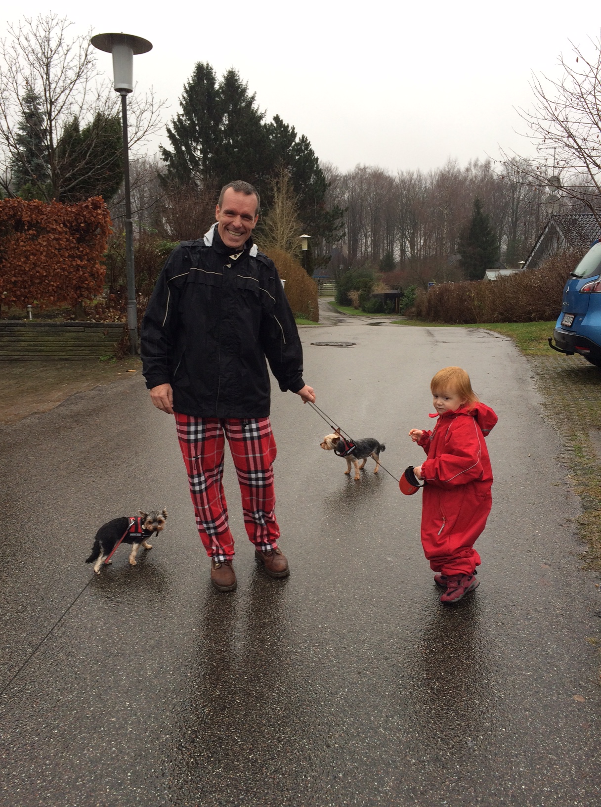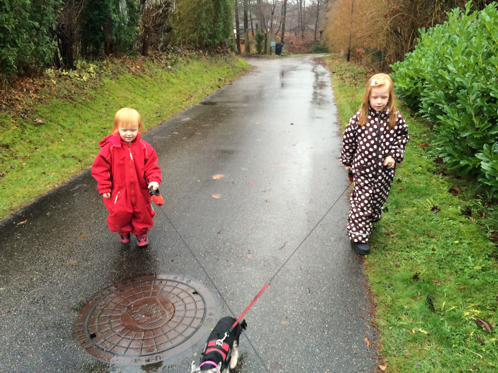 Og en gåtur med hundene i silende regnvejr, som pigerne finder meget eksotisk. De har ikke oplevet regnvejr mere end et par gange af få minutters varighed, siden vi flyttede til Ørkenstaten.