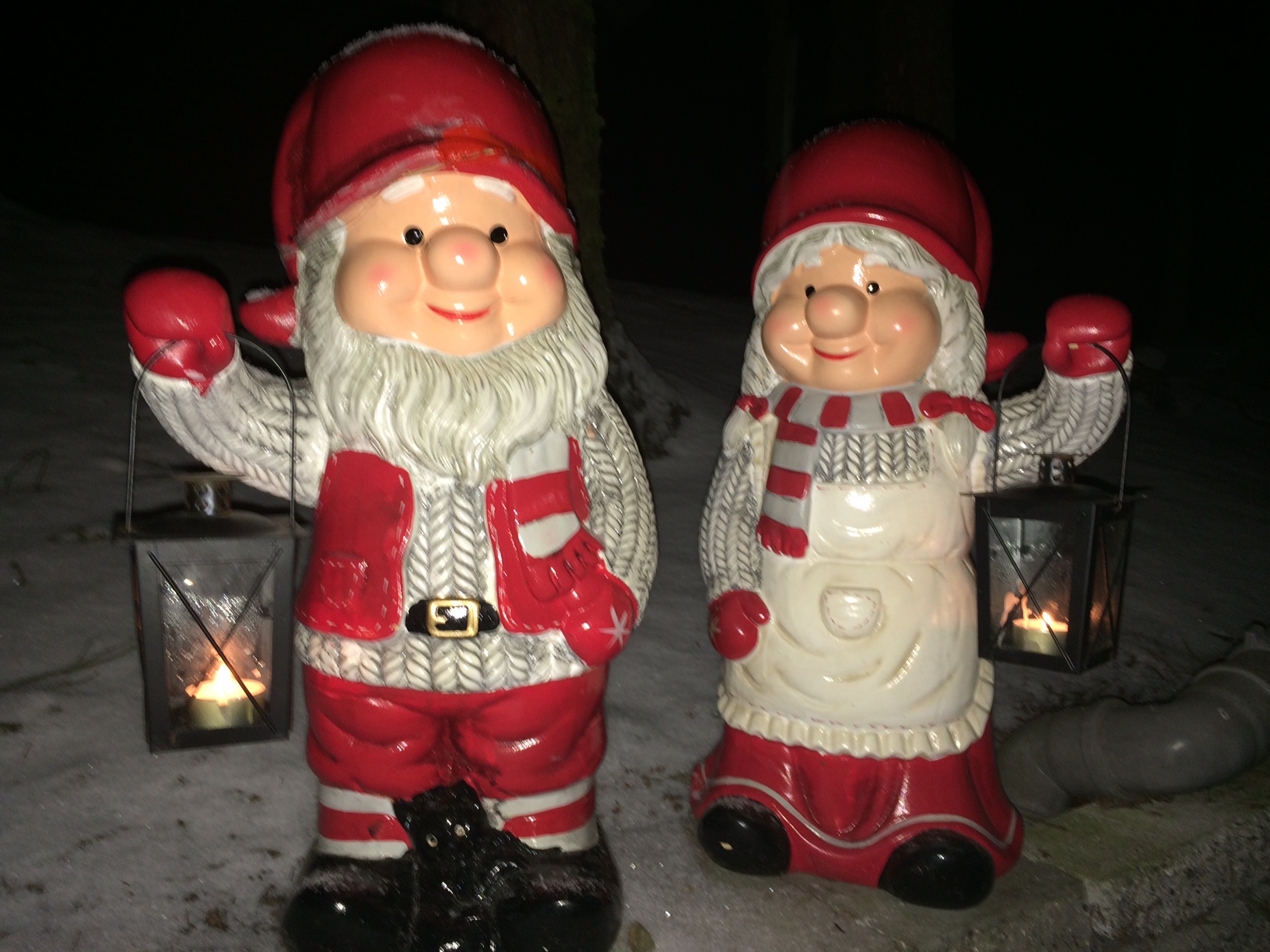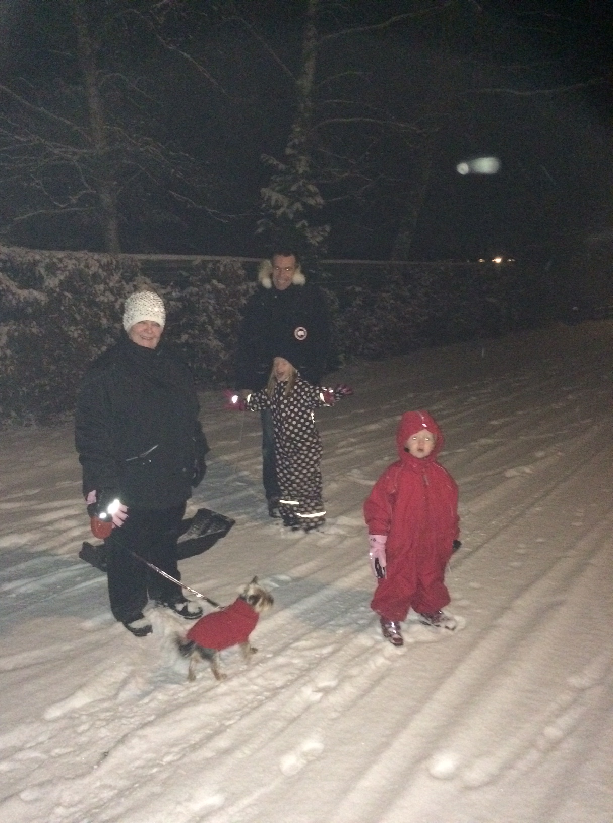 Vi spiser aftensmad og går straks en aftentur i sneen, mens snefnuggene daler. Det er ualmindeligt smukt vejr – især nu, hvor vi ikke længere skal køre i det, men kan nøjes med at kælke.