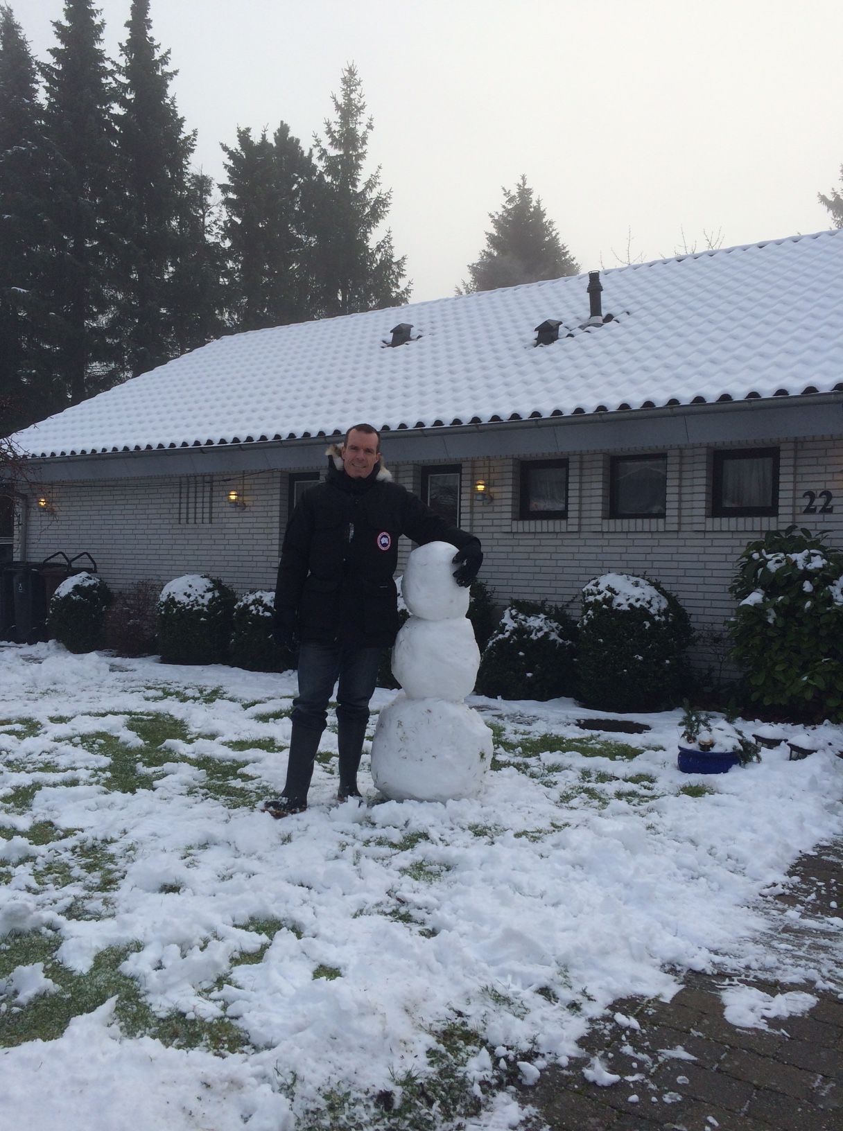 Martin bygger en snemand på et øjeblik. Sneen er perfekt til formålet.