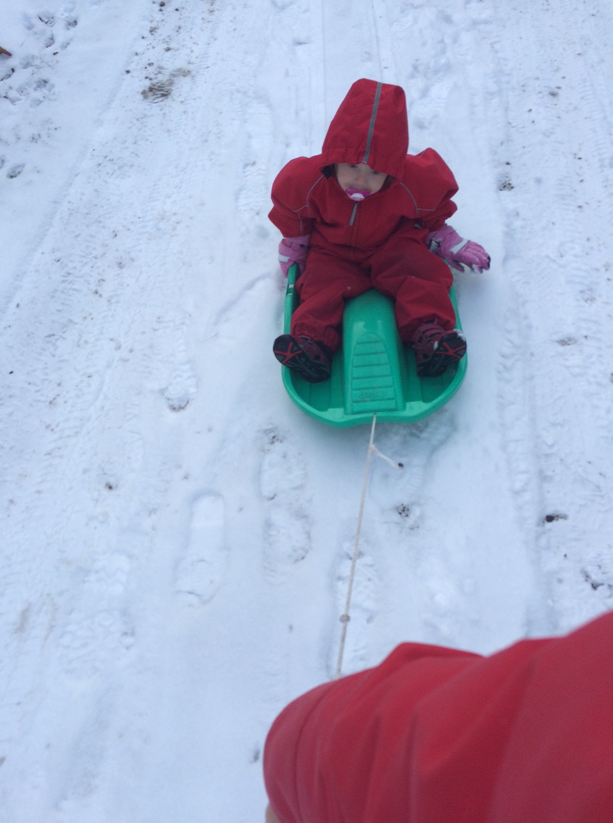 Mille insisterer på at blive trukket rundt i landsbyen i sin lille kælk. Hun sidder musestille og lytter til den knitrende sne.