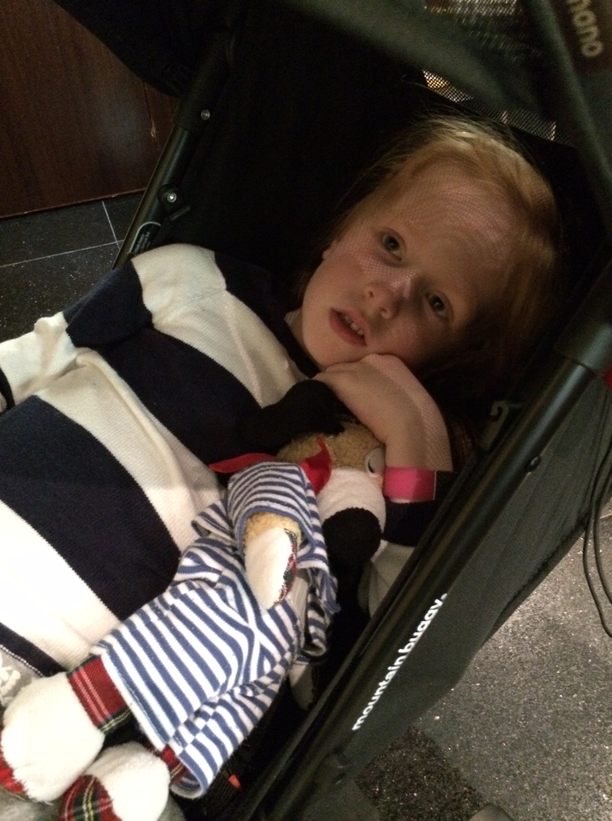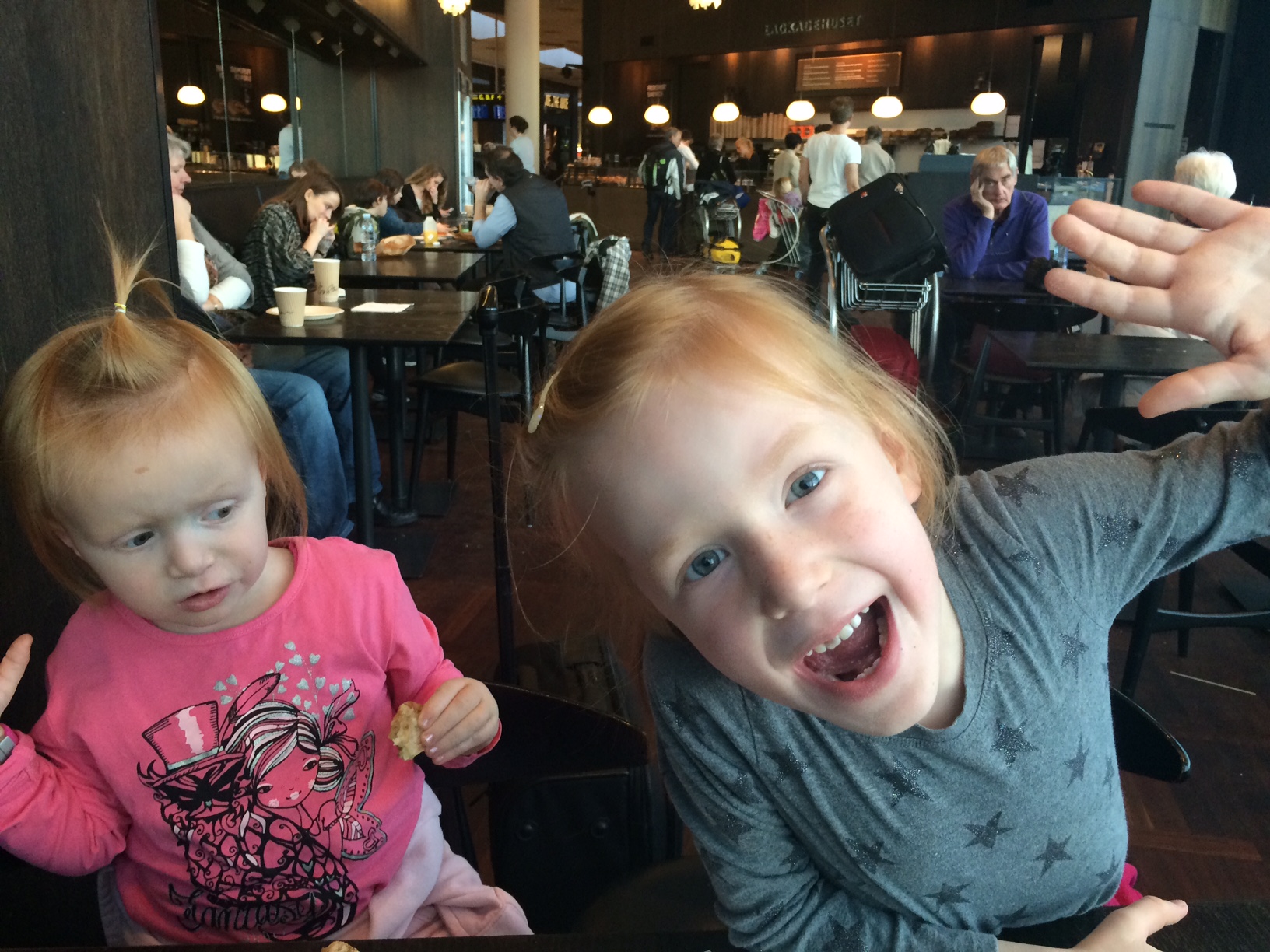 Vi står med 2 trætte piger, der har sovet elendigt ombord. Vi er sultne og irritable alle 4.