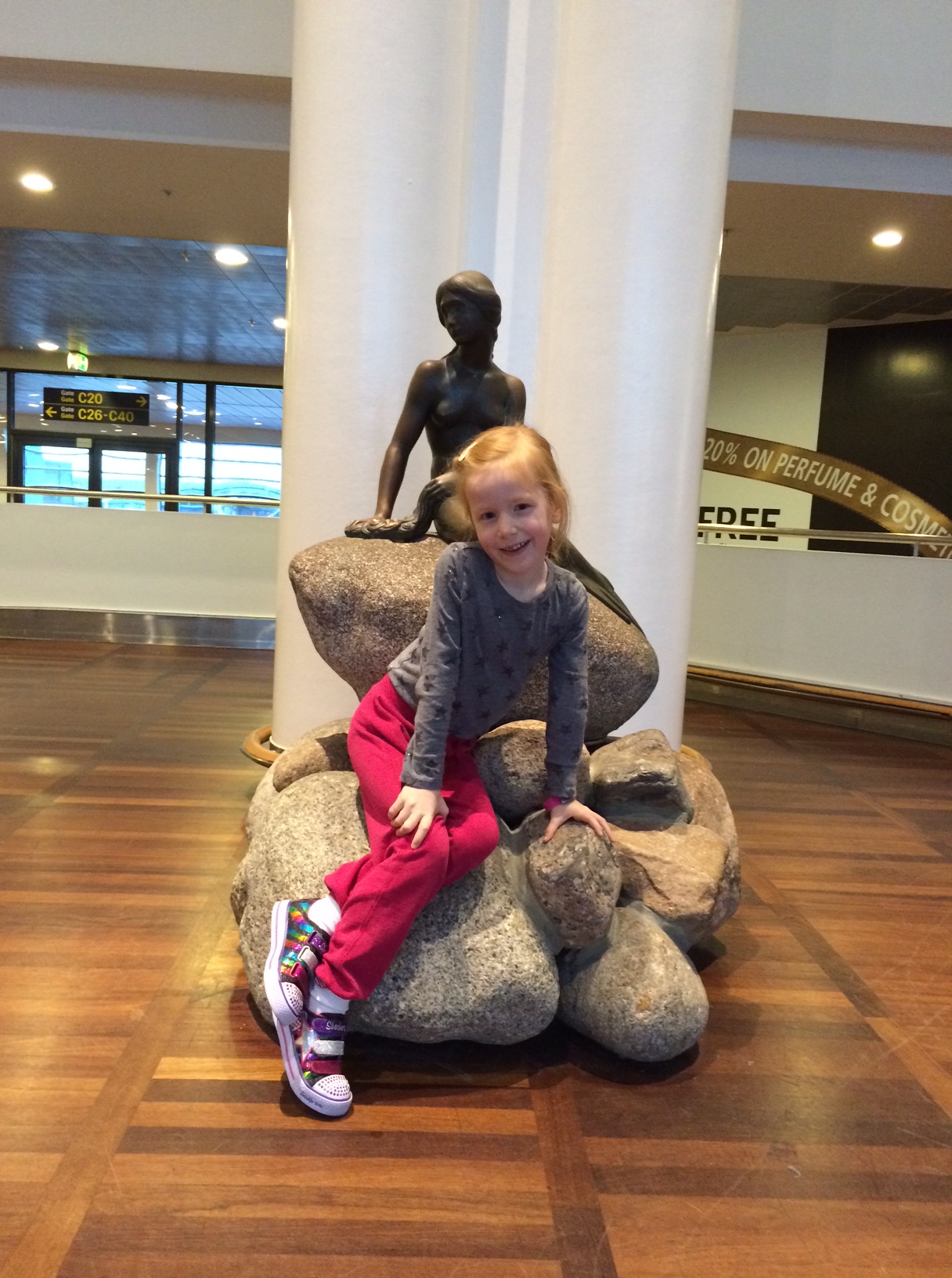 Og hun sætter sig som en havfrue ved siden af lufthavnens kopi af Den Lille Havfrue.