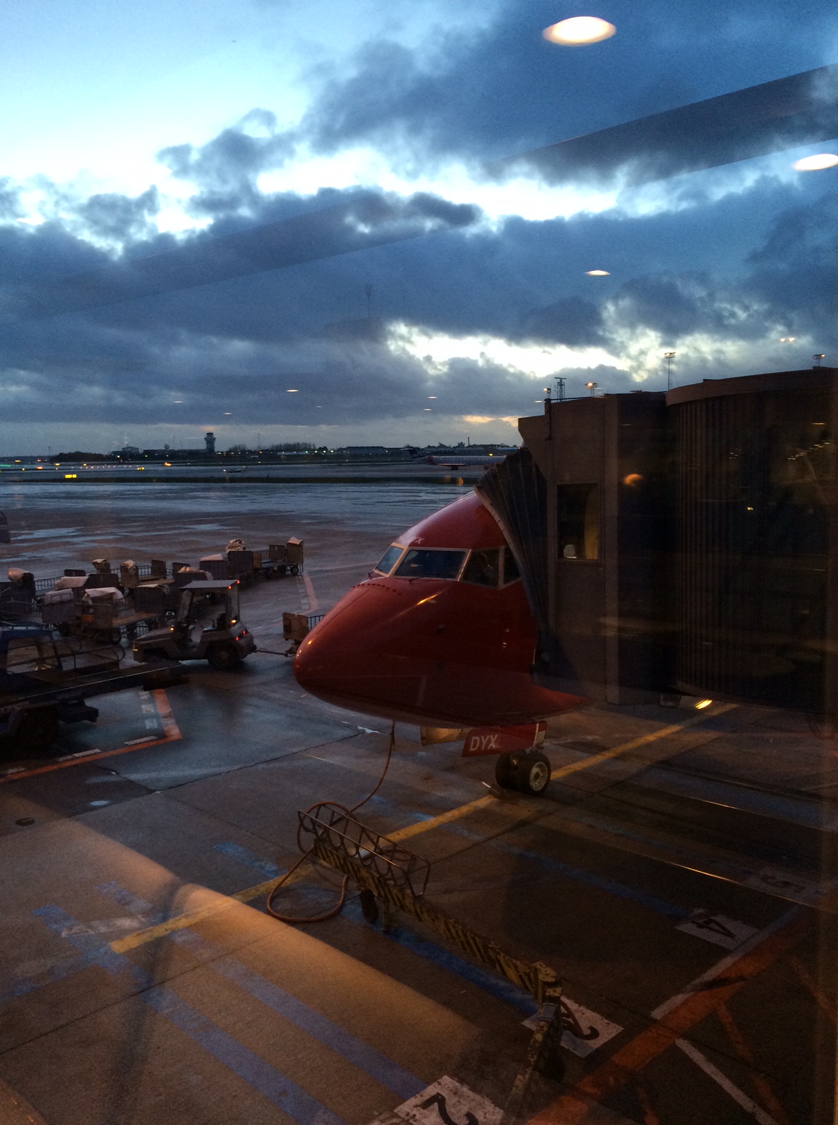 Vi sætter os i den lille lounge i lufthavnen. Der er bløde stole og ro. Rene toiletter, masser af rødvin og kaffe.