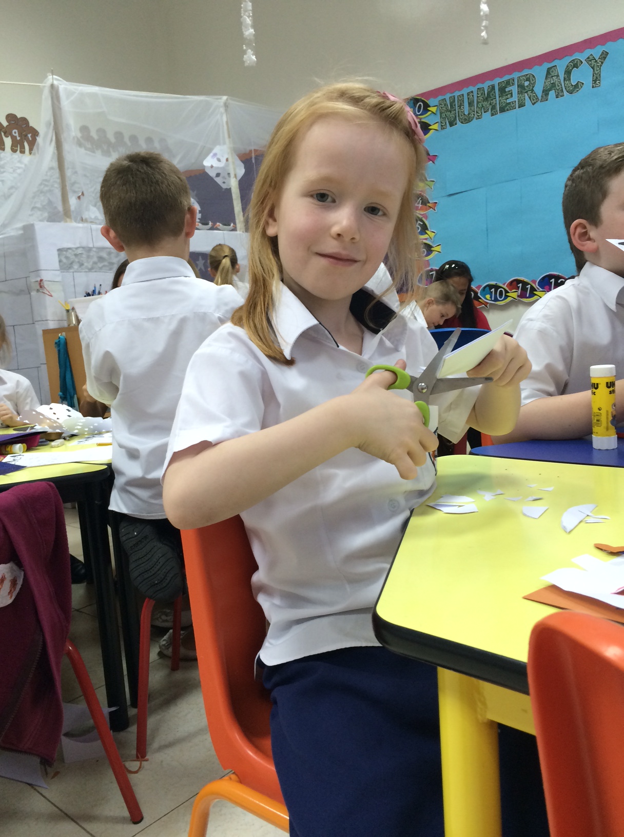 IMG_5233Hun viser stolt sin færdige pingvin til Miss Greenwood og går straks i gang med snefnugsklip.