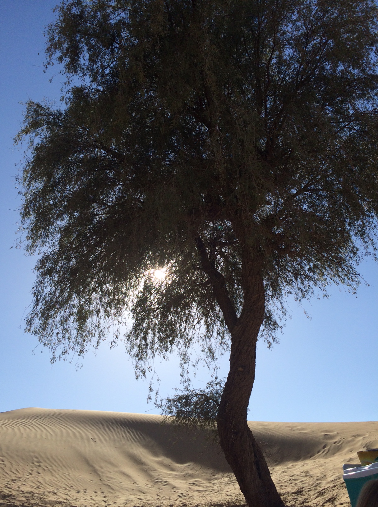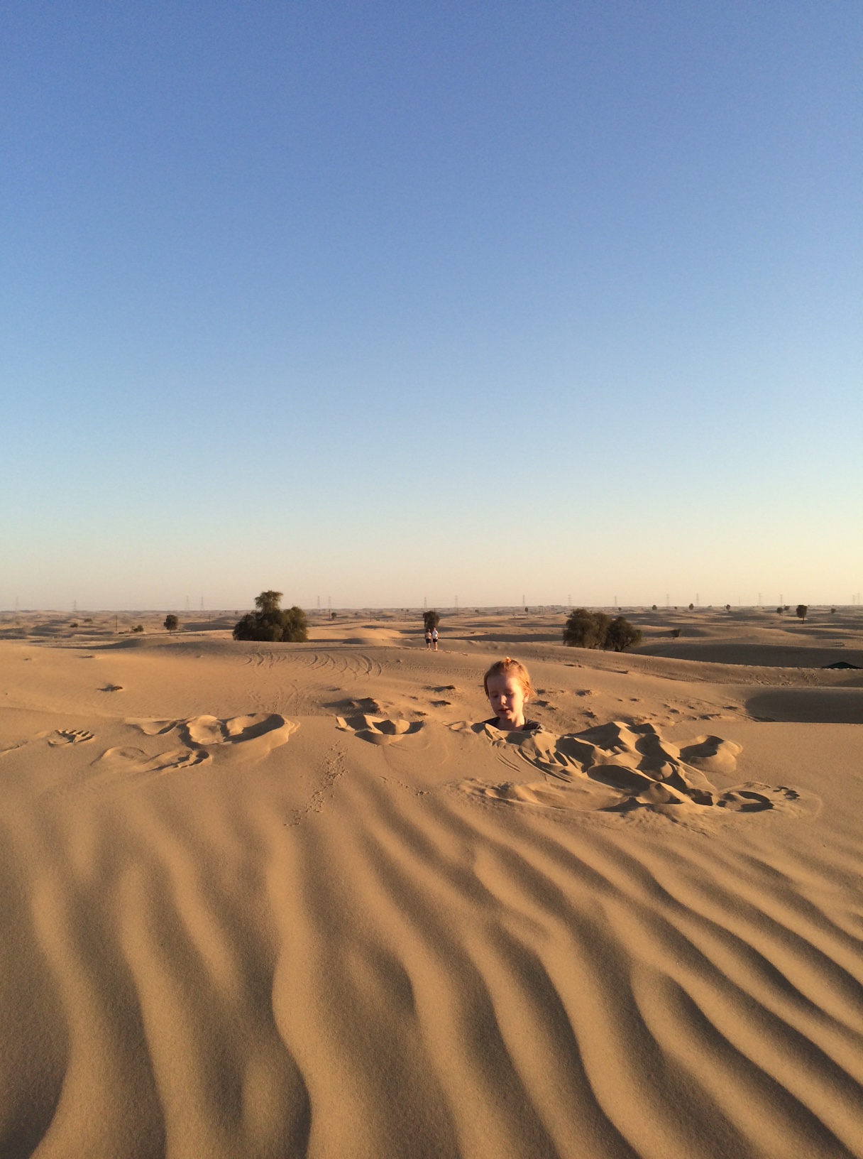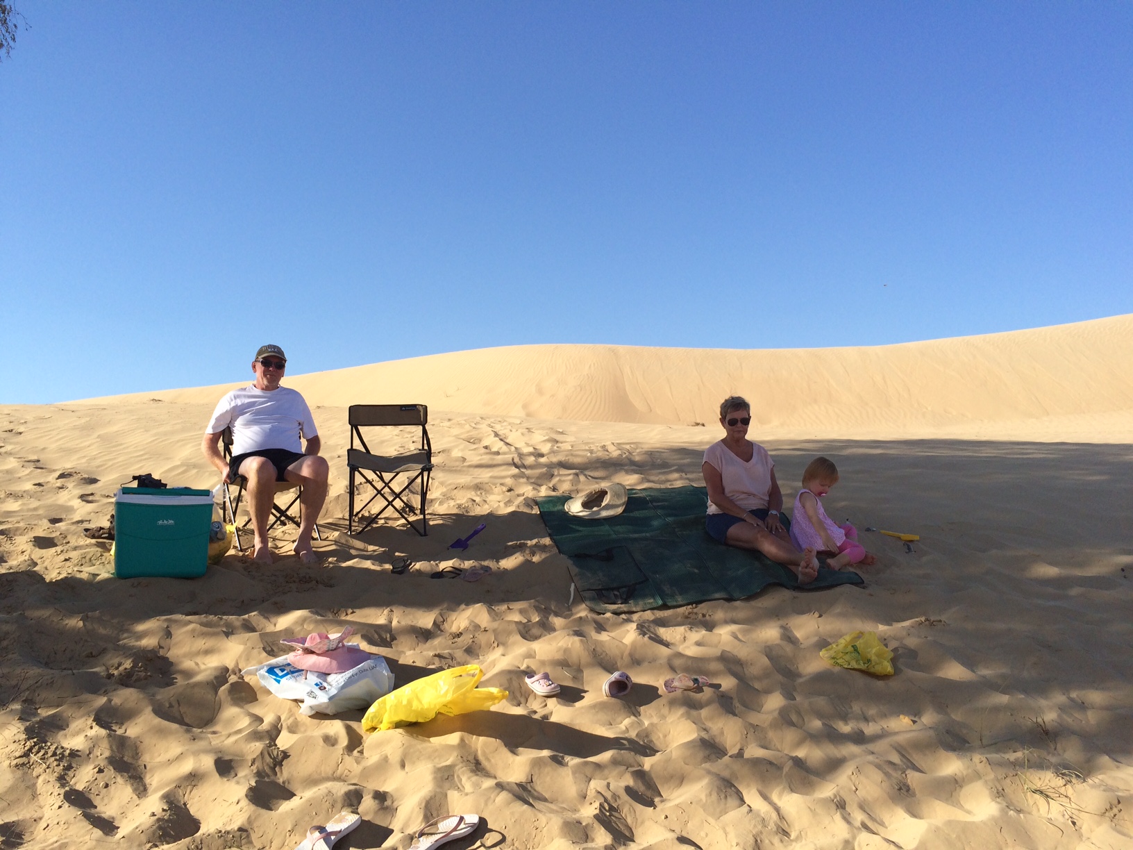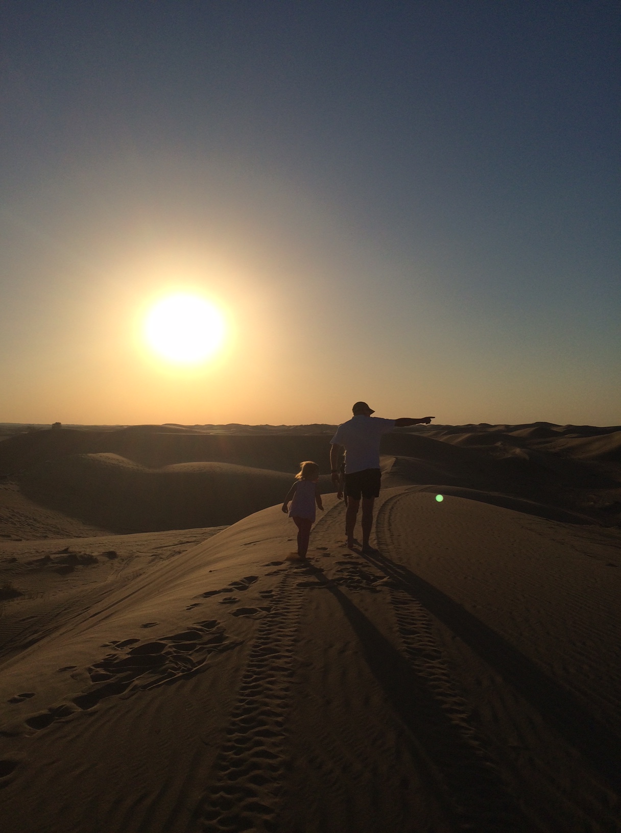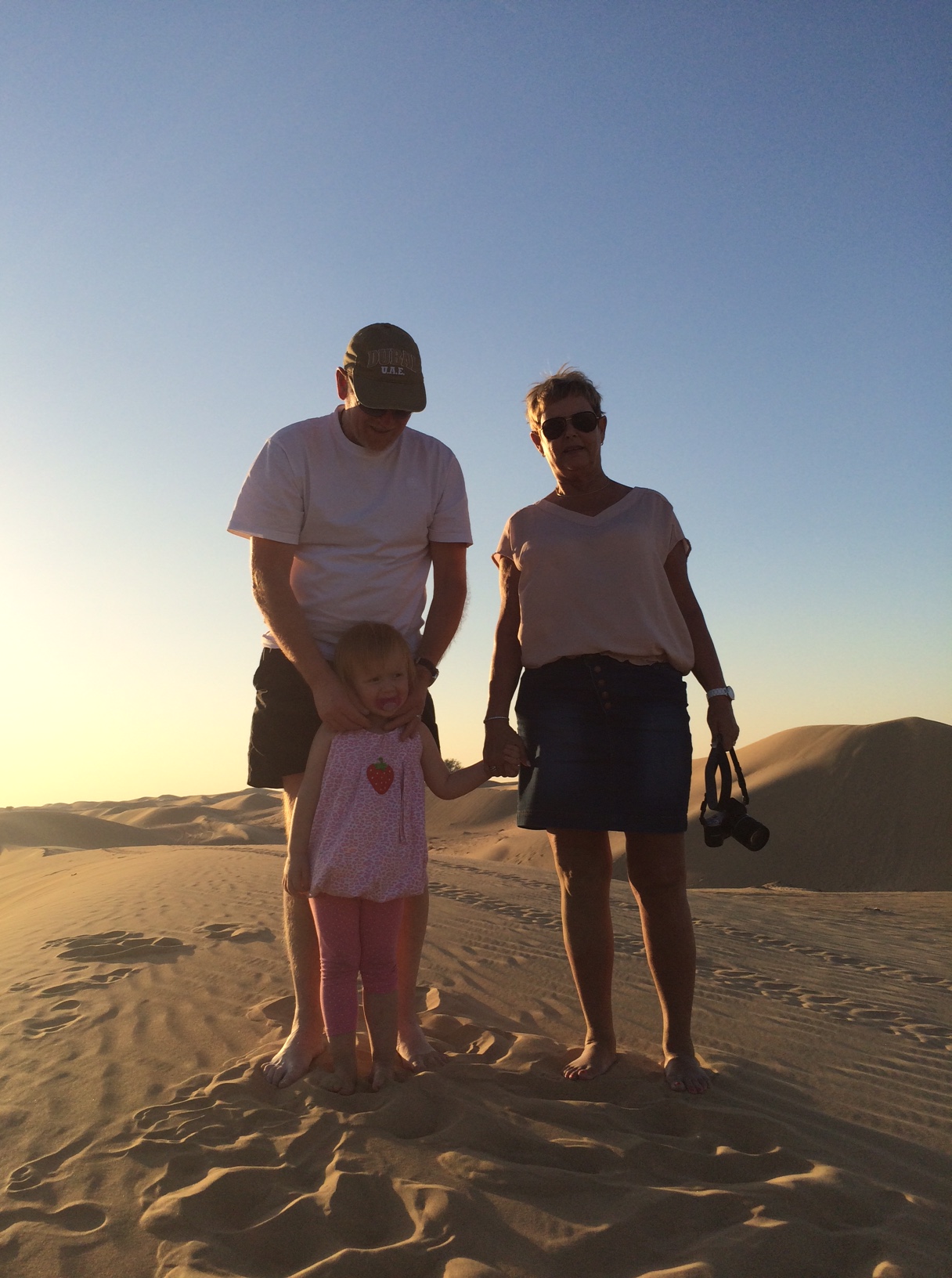 Den sidste dag med Morfar og Conny tilbringes i ørkenområdet Bawadi Al Qudra.IMG_5397Pigerne sover lur, mens vi kører de små 40 minutter derud fra Dubai, og de vågner først, da vi har slået lejr under et træ, og er gået tilbage til bilen for at hente dem.IMG_5387 Min Far har aldrig været den store fortaler for ture, der indbefatter ‘noget med sand’. Strand, ørken, legepladser – you name it – sand er bare ikke lige hans element.